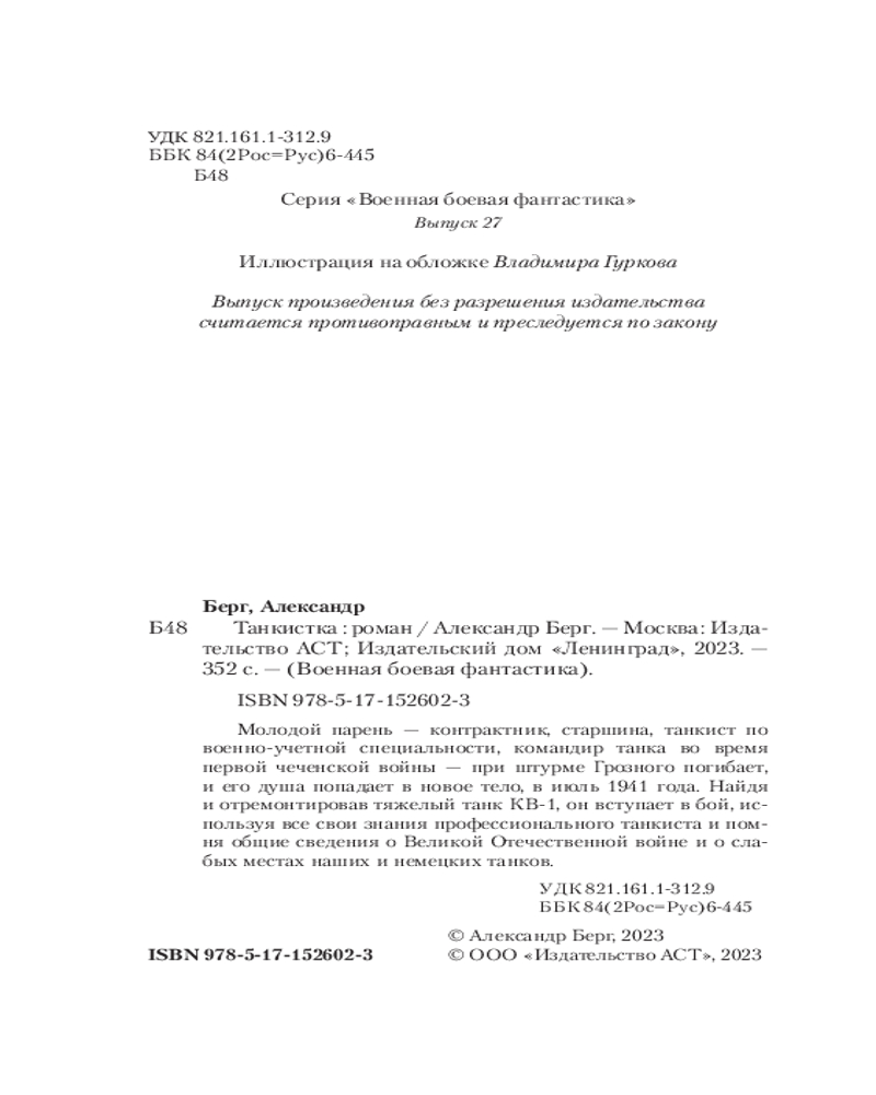 💳 Оплатить за товар можно при получении 🇰🇿 Есть бесплатная доставка по Казахстану от 1 дня 🎁 Копите бонусы с каждой покупки Серия: Военная боевая фантастика Молодой парень — контрактник, старшина, танкист по военно-учетной специальности, командир танка во время первой чеченской войны — при штурме Грозного погибает, и его душа попадает в новое тело, в июль 1941 года. Найдя и отремонтировав тяжелый танк КВ-1, он вступает в бой, используя все свои знания профессионального танкиста и помня общие сведения о Великой Отечественной войне и о слабых местах наших и немецких танков. |