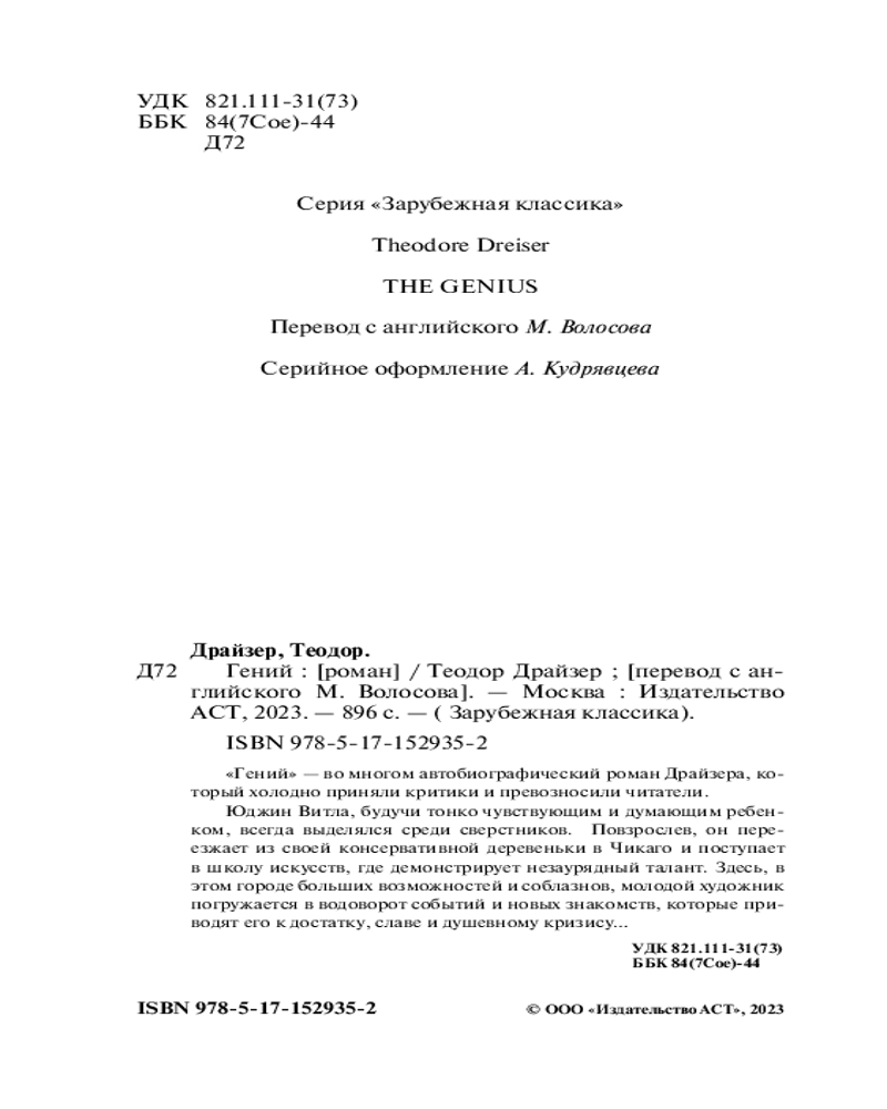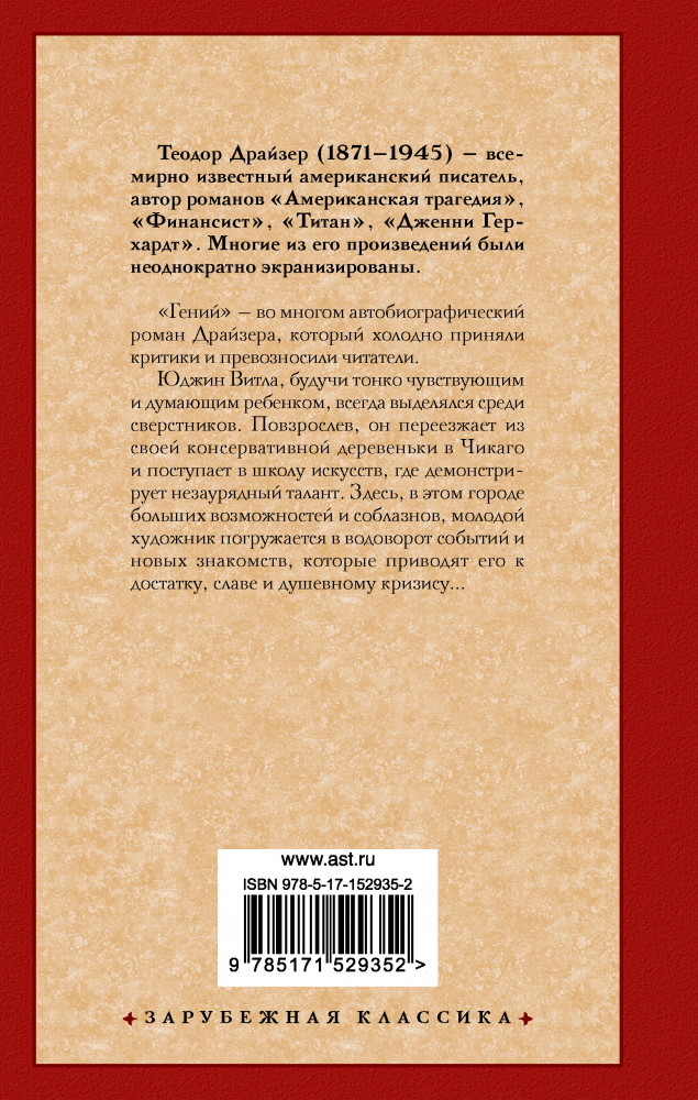 ГенийВ данный момент этот товар отсутствует в продаже. Возможно, у нас найдется аналогичный или похожий товар здесь. Серия: Зарубежная классика «Гений» — во многом автобиографический роман Драйзера, который холодно приняли критики и превозносили читатели. |