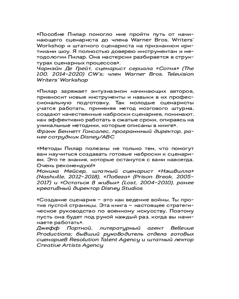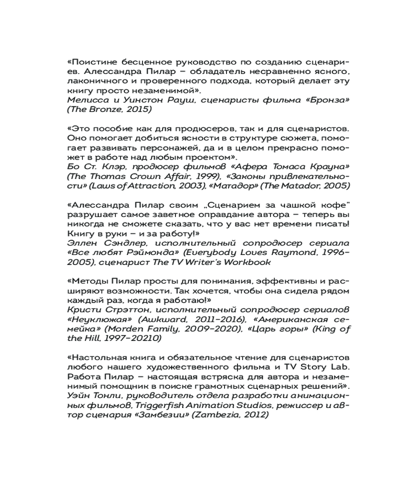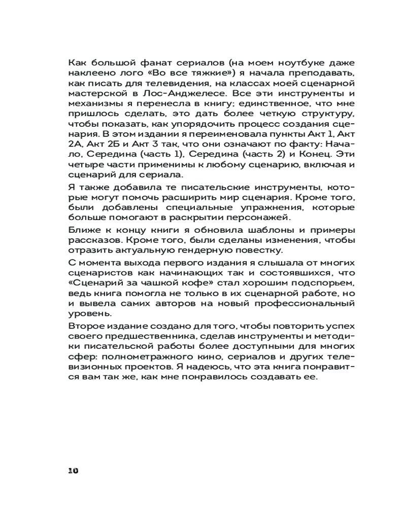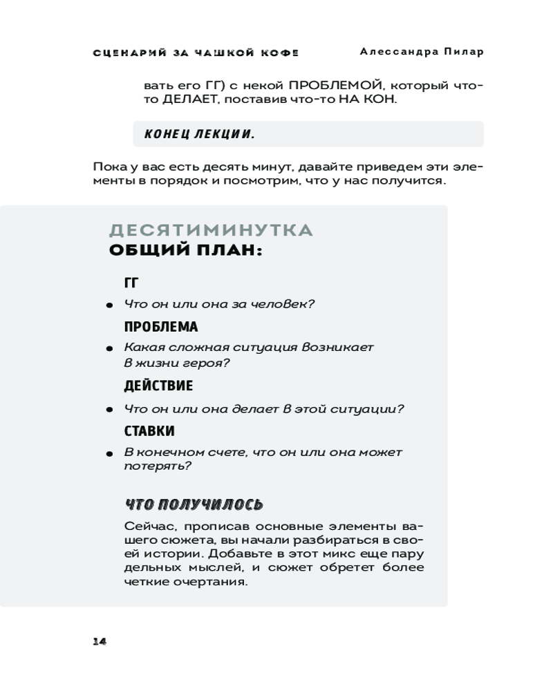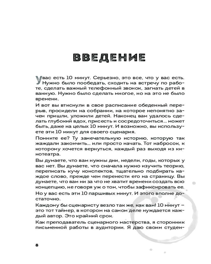 💳 Оплатить за товар можно при получении 🇰🇿 Есть бесплатная доставка по Казахстану от 1 дня 🎁 Копите бонусы с каждой покупки Серия: Сценарная мастерская. Секреты идеального текста У вас 10 минут. Казалось бы, что можно успеть за жалкие 10 минут? Выпить кофе? Пообедать? Покачать пресс? На самом деле многое! И даже написать сценарий. Если каждый день выделять хотя бы 10 минут, то уже совсем скоро из неоформленной идеи у вас начнут вырисовываться структура, персонажи и история. Главное — усердие и наставник, который поможет вам. И теперь у вас есть такой наставник. «Сценарий за чашкой кофе» — это идеальное учебное пособие для не только для начинающих сценаристов, но и помощник для уже опытных авторов. Пилар не только объясняет теорию, но и предлагает простые и эффективные упражнения для развития сценарного мастерства и писательского чутья. |