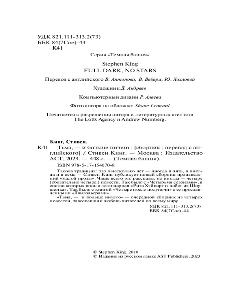 💳 Оплатить за товар можно при получении 🇰🇿 Есть бесплатная доставка по Казахстану от 1 дня 🎁 Копите бонусы с каждой покупки Серия: Темная Башня Такова традиция: раз в несколько лет — иногда пять, а иногда и семь — Стивен Кинг публикует новый сборник произведений «малой прозы». Чаще всего это рассказы, но иногда — четыре (обязательно четыре!) повести. Так было с «Четырьмя сезонами», в состав которых вошла легендарная «Рита Хэйворт и побег из Шоушенка». Так было с книгой «Четыре после полуночи» с ее прославленными «Лангольерами». |