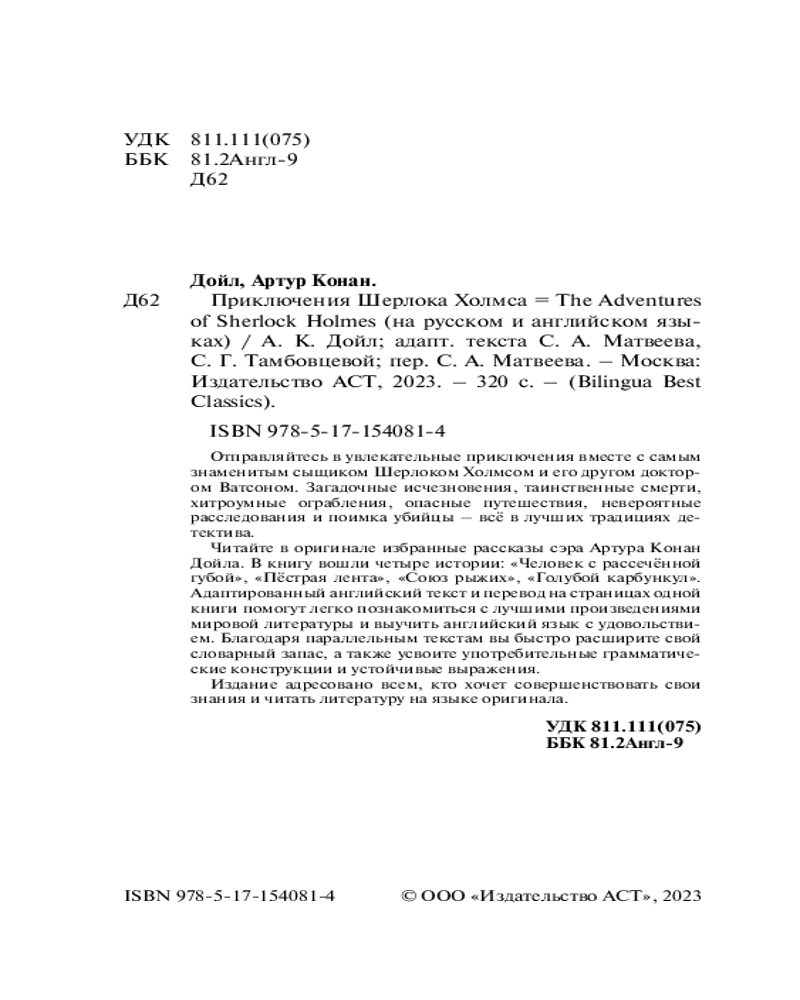 💳 Оплатить за товар можно при получении 🇰🇿 Есть бесплатная доставка по Казахстану от 1 дня 🎁 Копите бонусы с каждой покупки Серия: Bilingua Best Classics Отправляйтесь в увлекательные приключения вместе с самым знаменитым сыщиком Шерлоком Холмсом и его другом доктором Ватсоном. Загадочные исчезновения, таинственные смерти, хитроумные ограбления, опасные путешествия, невероятные расследования и поимка убийцы — всё в лучших традициях детектива. |
