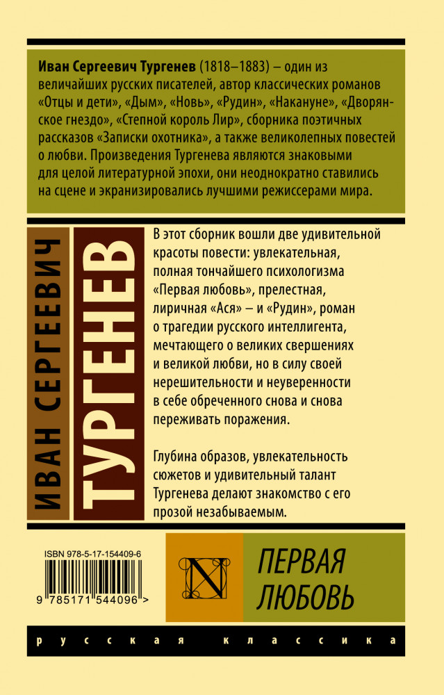 Первая любовьхорошая печать хорошая бумага удобный шрифт легкое чтение В данный момент этот товар отсутствует в продаже. Возможно, у нас найдется аналогичный или похожий товар здесь. Серия: Эксклюзив: Русская классика В этот сборник вошли две удивительной красоты повести: увлекательная, полная тончайшего психологизма «Первая любовь», прелестная, лиричная «Ася» — и «Рудин», роман о трагедии русского интеллигента, мечтающего о великих свершениях и великой любви, но в силу своей нерешительности и неуверенности в себе обреченного снова и снова переживать поражения. |