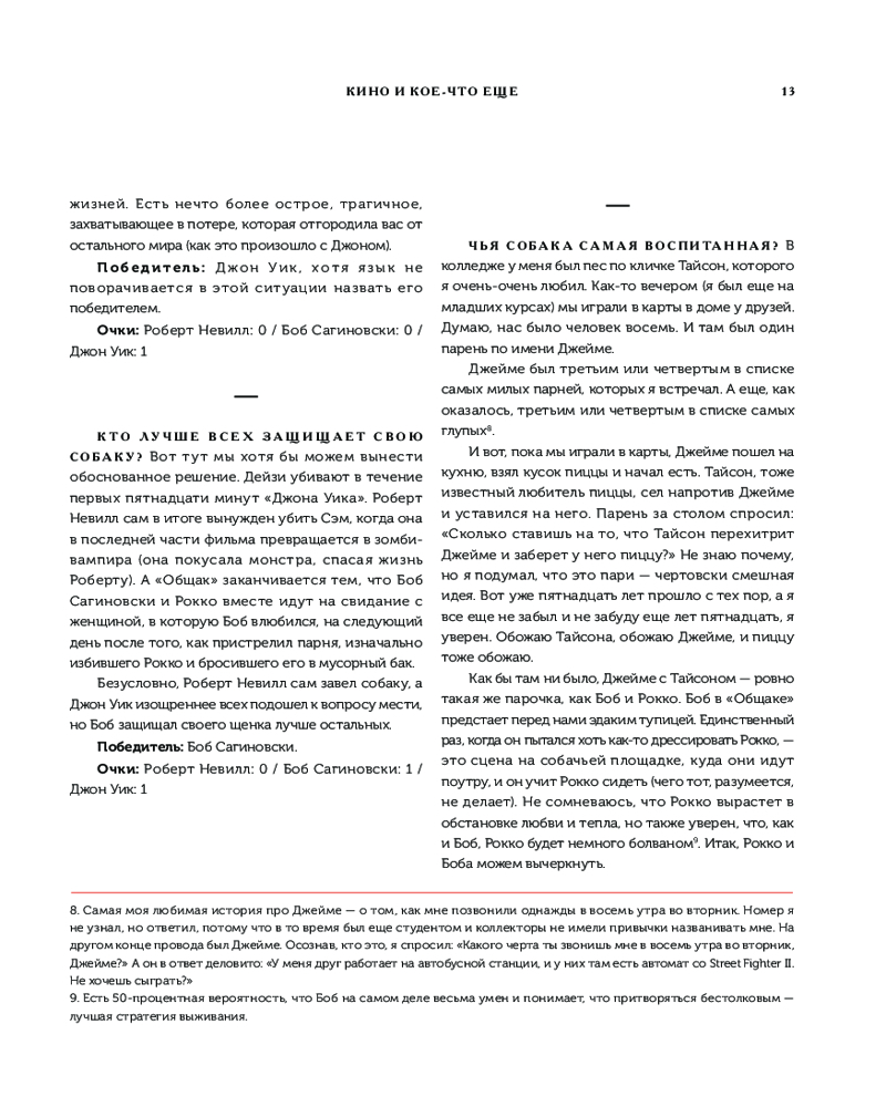 Очень просто. В ней тридцать глав, каждая — какой-то вопрос о кино, на который нужно ответить. Иногда это очень бестолковые вопросы, а иногда — весьма серьезные. Но я отвечаю на них (надеюсь, что так) с огромным вниманием и уважением. Читайте ее, как вам захочется. Не нужно, скажем, читать главу 13 (о блокбастерах), чтобы понять смысл главы 14 (о фильме «Селена»). О, и еще: в книге довольно много рисунков. Мне нравятся иллюстрации, потому что они придают законченность всему и помогают перенести читателя в ту обстановку, в которой был я сам, когда это писал. Есть, к примеру, глава, написанная в форме пресс-конференции, которую проводит Майк Майерс — звезда франшизы «Хэллоуин». Глупо, конечно, но там есть рисунок Майка за трибуной перед толпой журналистов, и когда смотришь на него, то переносишься в ту обстановку, и начинает казаться, что это не вымышленная ситуация, а реальный случай.