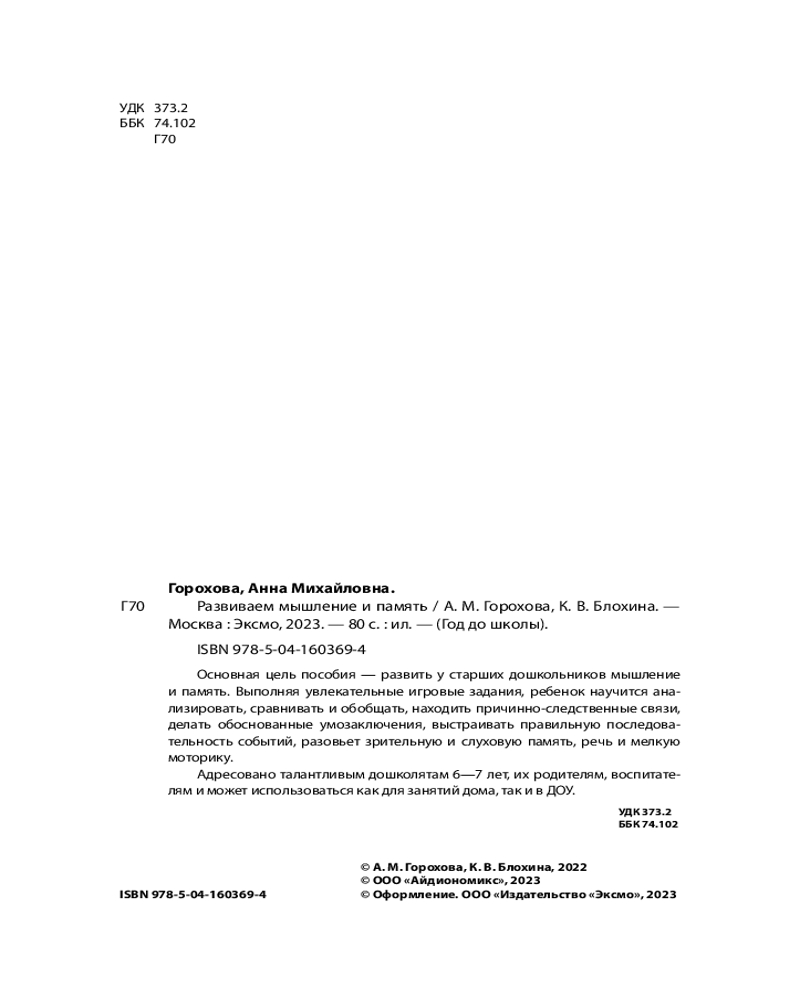 Развиваем мышление и памятьАнна Михайловна Горохова, Ксения Владимировна Блохина В данный момент этот товар отсутствует в продаже. Возможно, у нас найдется аналогичный или похожий товар здесь. Серия: Год до школы (обложка) Пособие подскажет родителям, как грамотно организовать занятия, на что в первую очередь обратить внимание, как качественно подготовить ребенка к школе. Работая с пособием, дошкольник будет делать логические умозаключения и выстраивать точную последовательность событий, анализировать и находить причинно-следственные связи, сравнивать и обобщать, сможет развить зрительную и слуховую память, речь и мелкую моторику, а также получит весь необходимый для своего возраста объем знаний, умений и навыков. |