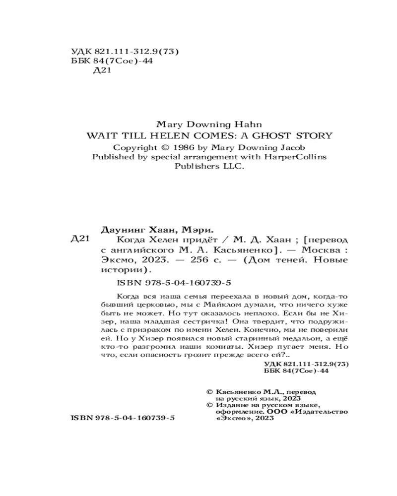 Серия: Детск. Дом теней. Новые истории Молли, Майкл и Хизер вместе с родителями переезжают в новый дом, который когда-то был церковью, расположенный в стороне от города. Хизер, самая младшая из всех, говорит, что познакомилась с призраком по имени Хелен. И что если кто-то будет ее обижать, то Хелен всем устроит! Эти разговоры пугают, но вдруг это не детские выдумки, а призрак существует на самом деле и задумал недоброе?.. |