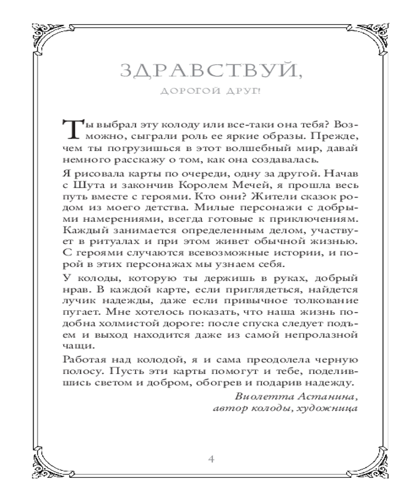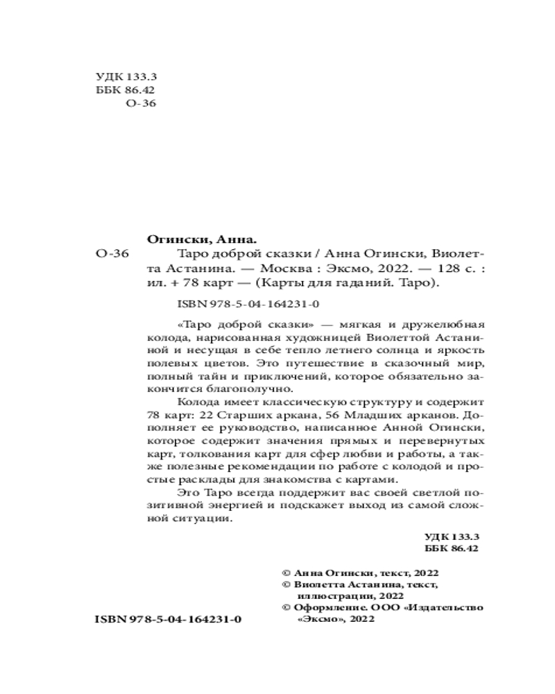 Таро доброй сказкиВ данный момент этот товар отсутствует в продаже. Возможно, у нас найдется аналогичный или похожий товар здесь. Серия: Карты для гаданий. Таро «Таро доброй сказки» — мягкая и дружелюбная колода Виолетты Астаниной и Анны Огински, несущая в себе тепло летнего солнца и яркость полевых цветов. Это путешествие в сказочный мир, полный тайн и приключений, которое обязательно закончится благополучно. Это Таро поддержит вас своей светлой позитивной энергией и подскажет выход из самой сложной ситуации. |