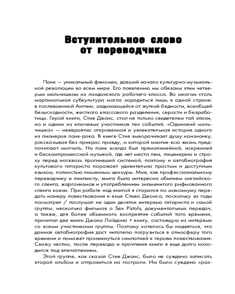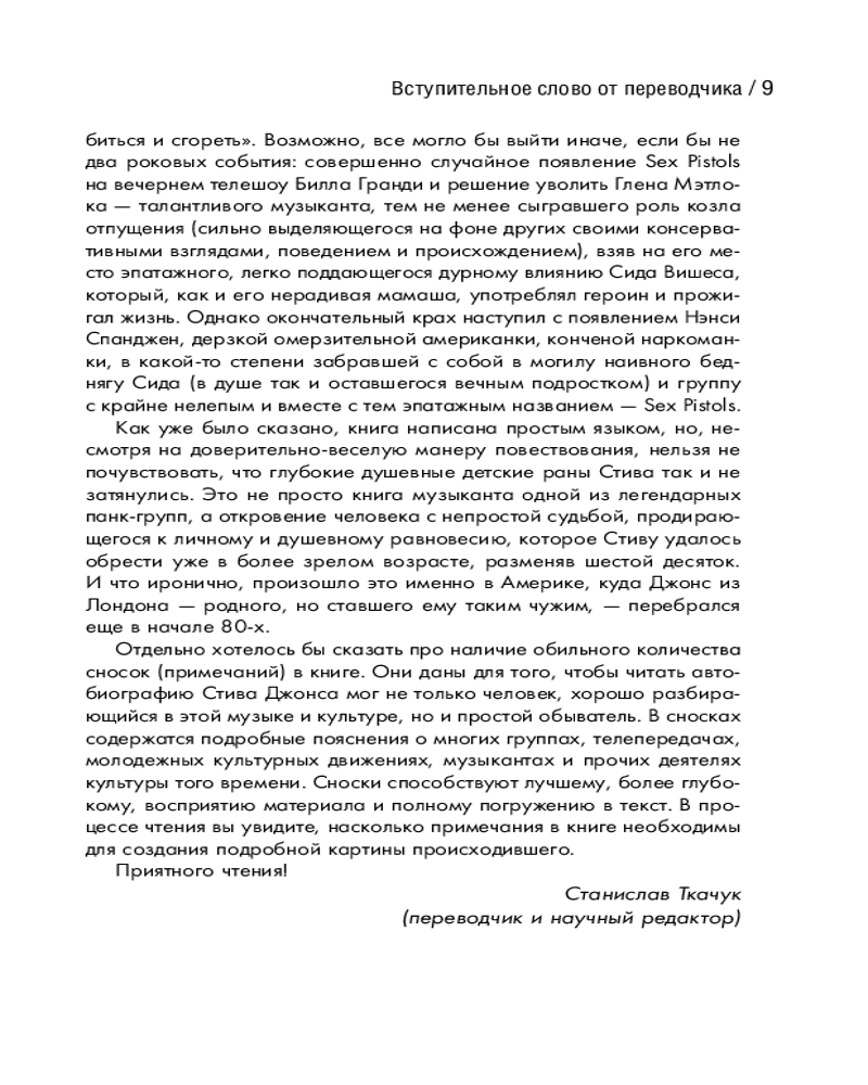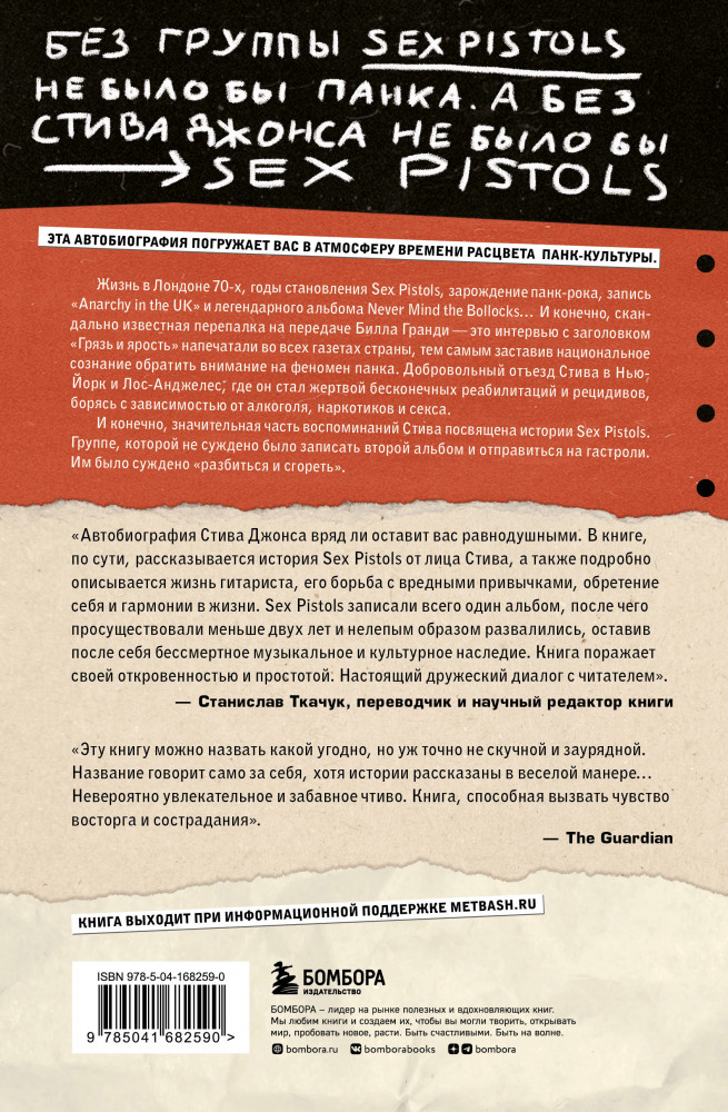 «Автобиография Стива Джонса вряд ли оставит вас равнодушными. В книге, по сути, рассказывается история Sex Pistols от лица Стива, но и подробно описывается жизнь гитариста, его борьба с вредными привычками, обретение себя и гармонии в жизни. Sex Pistols записали всего один альбом, после чего просуществовали меньше двух лет и нелепым образом развалились, оставив после себя бессмертное музыкальное и культурное наследие. Книга поражает своей откровенностью и простотой. Настоящий дружеский диалог с читателем». — Станислав Ткачук, переводчик и научный редактор книги.