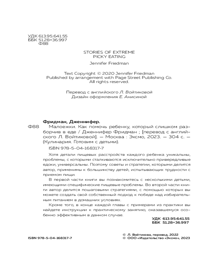 💳 Оплатить за товар можно при получении 🇰🇿 Есть бесплатная доставка по Казахстану от 1 дня 🎁 Копите бонусы с каждой покупки Серия: Кулинария. Готовим с детьми Эта книга для родителей, которые столкнулись с серьезной проблемой своих детей, а именно: отсутствием желания есть, непониманием, что без еды нельзя жить и расти. Автор книги Дженнифер Фридман ─ магистр наук в области питания, дипломированный диетолог, которая специализируется на проблемах исключительно разборчивого питания. Она рассказывает о нескольких семьях, с которыми работала и получила положительные результаты, и предлагает реальные практические пути изменения отношения детей и их родителей к еде, к процессу питания, к знакомству с продуктами, их выбору и приготовлению. |