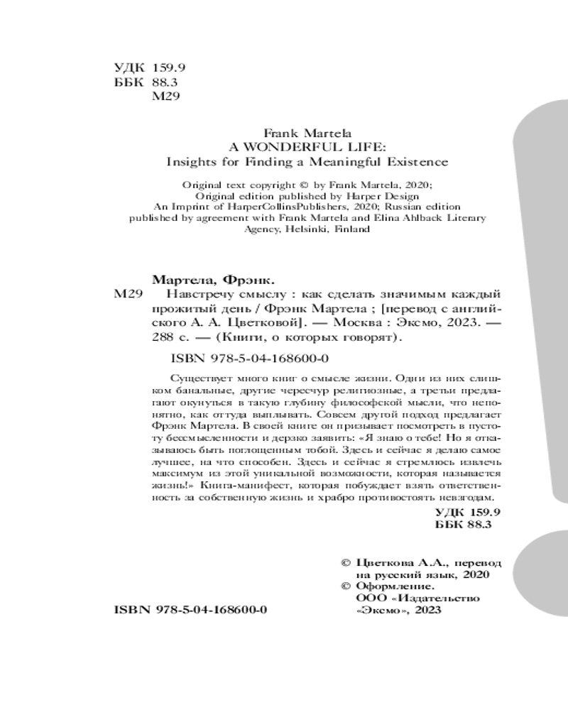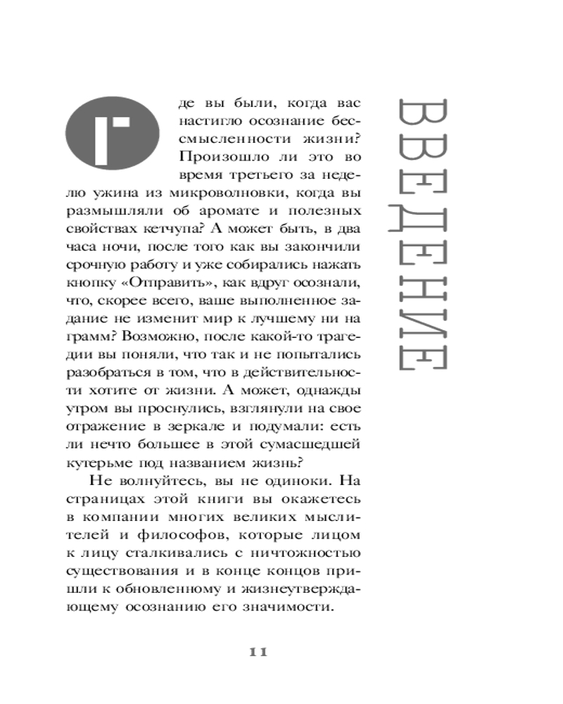 Навстречу смыслу. Как сделать значимым каждый прожитый деньВ данный момент этот товар отсутствует в продаже. Возможно, у нас найдется аналогичный или похожий товар здесь. Серия: Книги, о которых говорят Где вы были, когда вас настигло осознание бессмысленности жизни? Произошло ли это во время третьего за неделю ужина из микроволновки, когда вы размышляли об аромате и полезных свойствах кетчупа? А может быть, в два часа ночи после того, как вы закончили срочную работу и уже собирались нажать кнопку «Отправить», как вдруг осознали, что, скорее всего, ваше выполненное задание не изменит мир к лучшему ни на грамм? А может, однажды утром вы проснулись, взглянули на свое отражение в зеркале и подумали, есть ли нечто большее в этой сумасшедшей кутерьме под названием жизнь. |