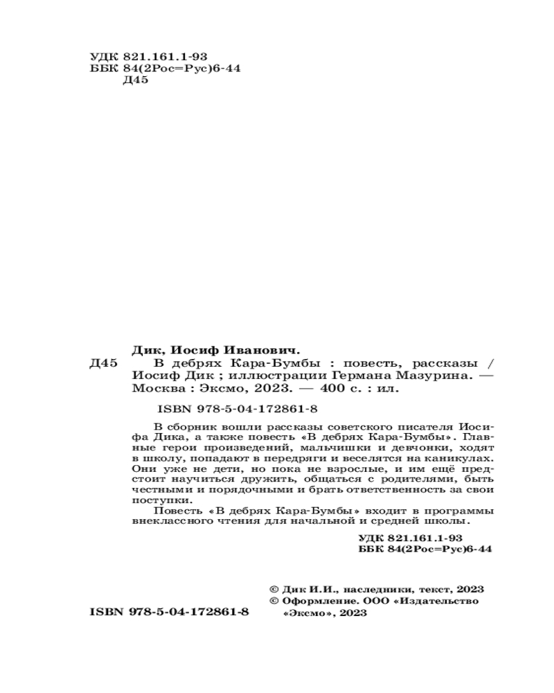 В данный момент этот товар отсутствует в продаже. Возможно, у нас найдется аналогичный или похожий товар здесь. Серия: Детская библиотека (новое оформление) В сборник вошли глубокие и искренние рассказы Иосифа Дика о мальчишках и девчонках и повесть «В дебрях Кара-Бумбы».