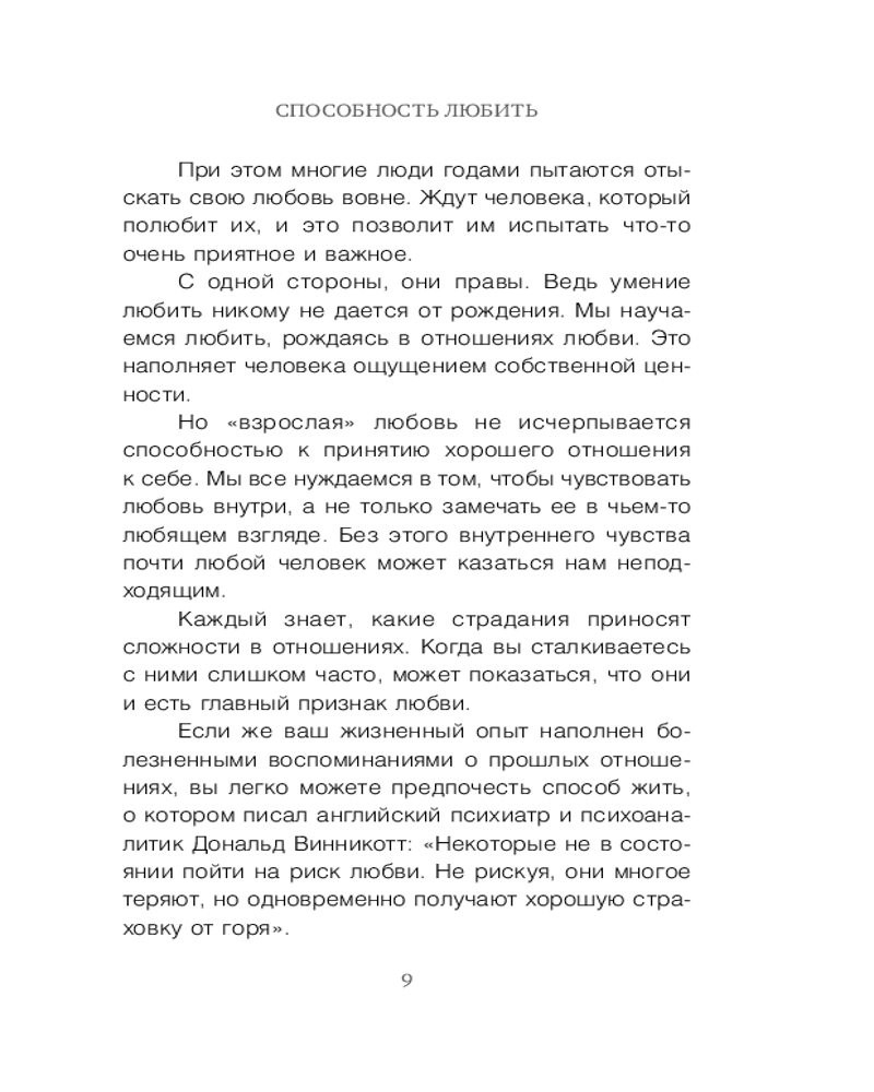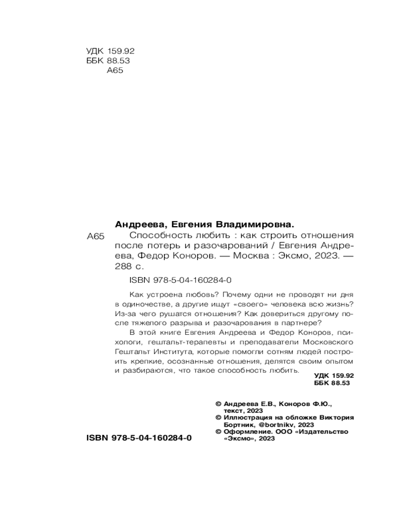 💳 Оплатить за товар можно при получении 🇰🇿 Есть бесплатная доставка по Казахстану от 1 дня 🎁 Копите бонусы с каждой покупки Серия: Top expert. Практичные книги для работы над собой Как устроена любовь? Почему одни не проводят ни дня в одиночестве, а другие ищут «своего» человека всю жизнь? Из-за чего рушатся отношения? Как довериться другому после тяжелого разрыва и разочарования в партнере? В этой книге Евгения Андреева и Федор Коноров, психологи, гештальт-терапевты и преподаватели Московского Гештальт Института, которые помогли сотням людей построить крепкие, осознанные отношения, делятся своим опытом и разбираются, что такое способность любить. |