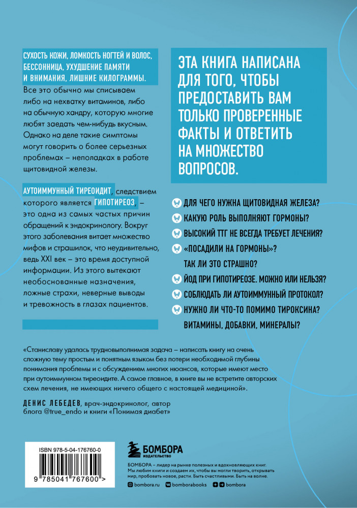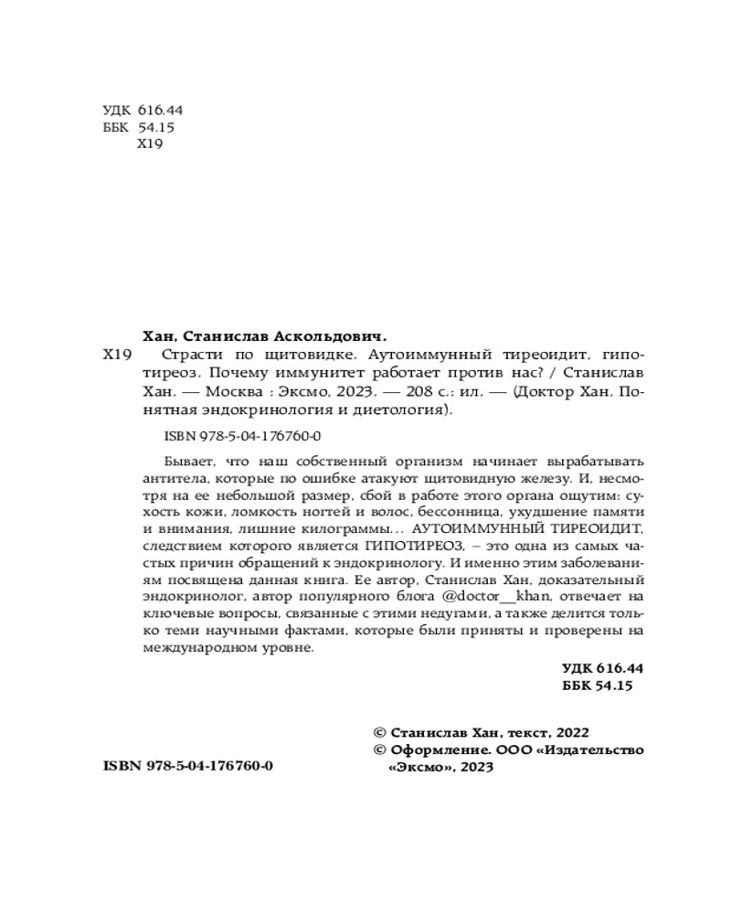 💳 Оплатить за товар можно при получении 🇰🇿 Есть бесплатная доставка по Казахстану от 1 дня 🎁 Копите бонусы с каждой покупки Серия: Доктор Хан. Понятная эндокринология и диетология Аутоиммунный тиреоидит — это одно из самых распространенных заболеваний щитовидной железы, которое может скрываться за множеством жалоб. Начиная с выпадения волос, сухости кожи, поражения желудочно-кишечного тракта, заканчивая нарушением менструального цикла. Из-за всего этого многообразия симптомов возникает множество вопросов, на которые отвечает доказательный врач-эндокринолог Станислав Хан. |