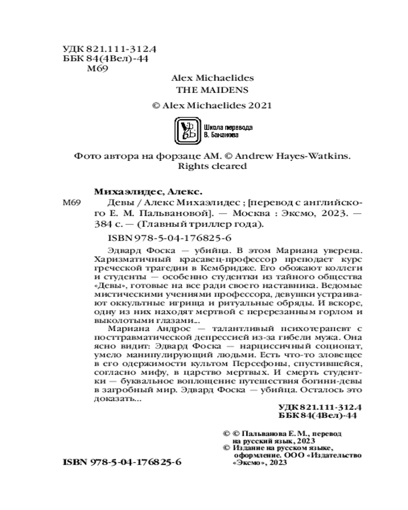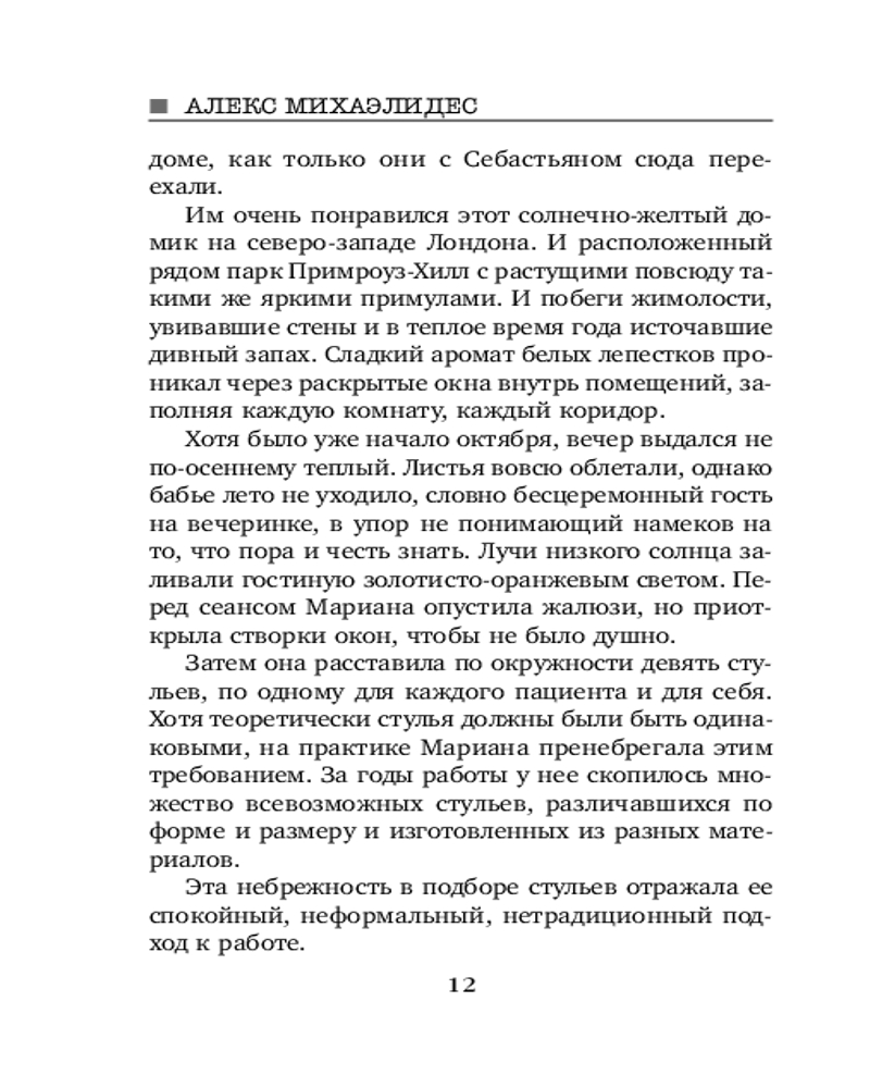 Алекс Михаэлидес — писатель и сценарист греко-киприотско-английского происхождения. Будущий писатель родился и вырос на Кипре. Его мать — англичанка, а отец греко-кипрского происхождения. До 18 лет ходил в школу на Кипре, затем изучал английскую литературу в Университете Кембриджа, имеет степень магистра сценарного мастерства Американского института киноискусства. Написал сценарии к фильмам «Дьявол, которого ты знаешь» (2013) и «Аферисты поневоле» (2018). «Безмолвный пациент» — его первая... |