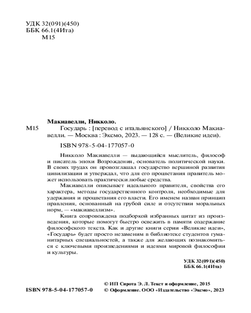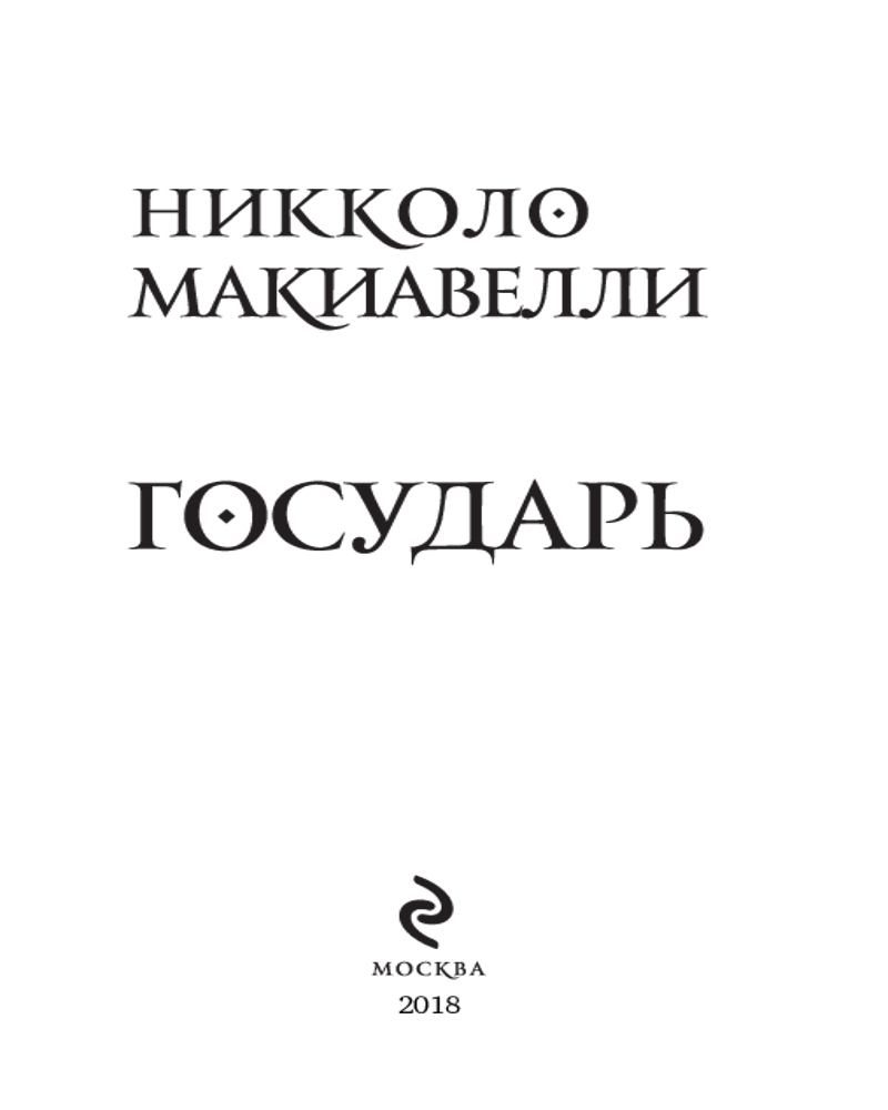 В данный момент этот товар отсутствует в продаже. Возможно, у нас найдется аналогичный или похожий товар здесь. Серия: Великие идеи (обложка) Классическое, не теряющее своей актуальности произведение итальянского мыслителя и политического деятеля эпохи Возрождения Никколо Макиавелли. Благодаря этому философскому труду читатель сможет познакомиться с ключевыми идеями государственности.
