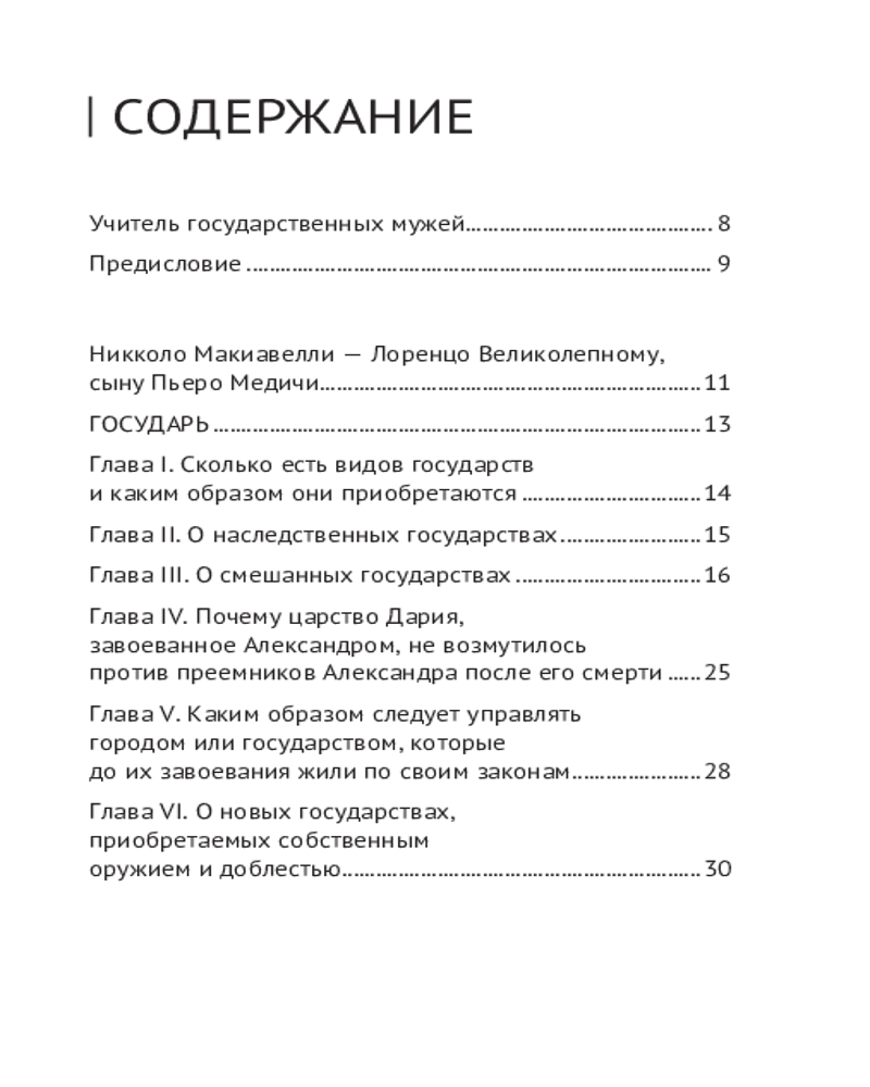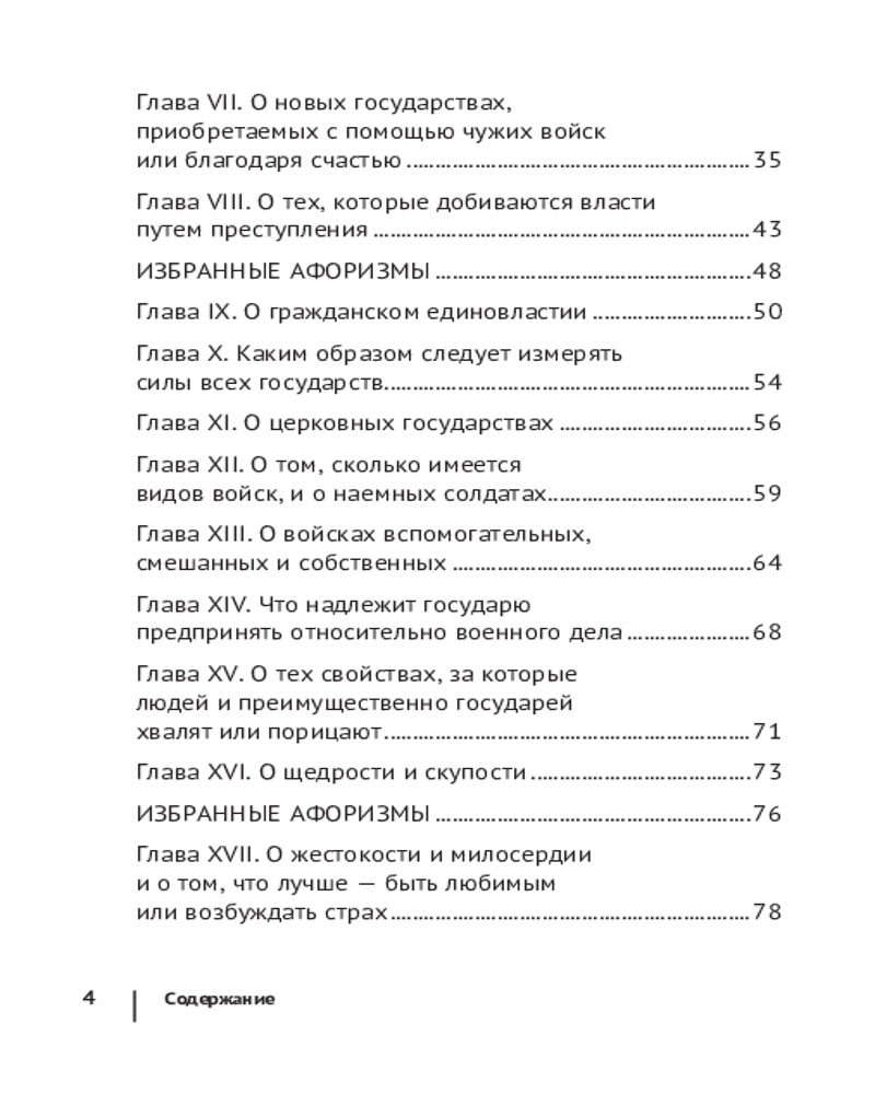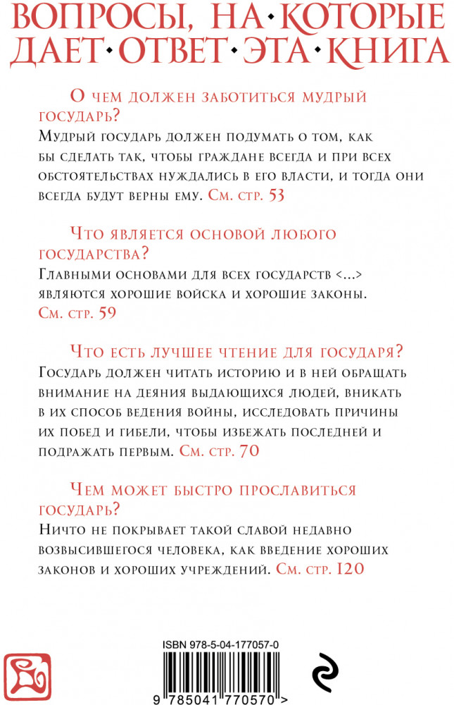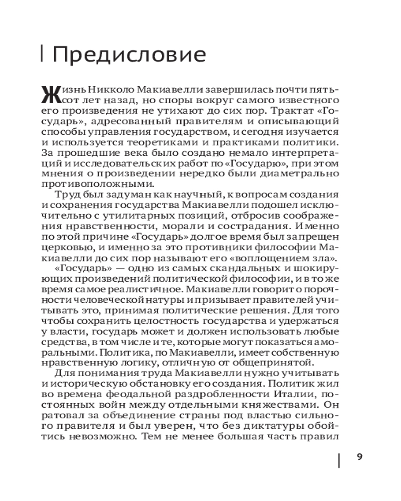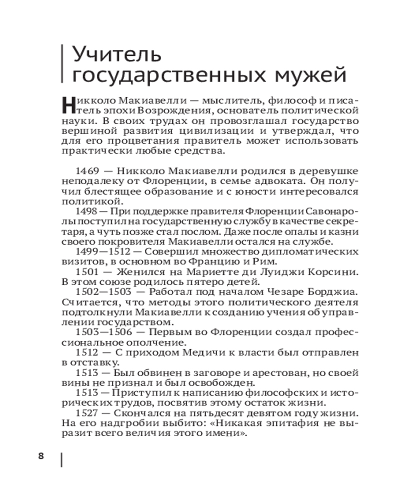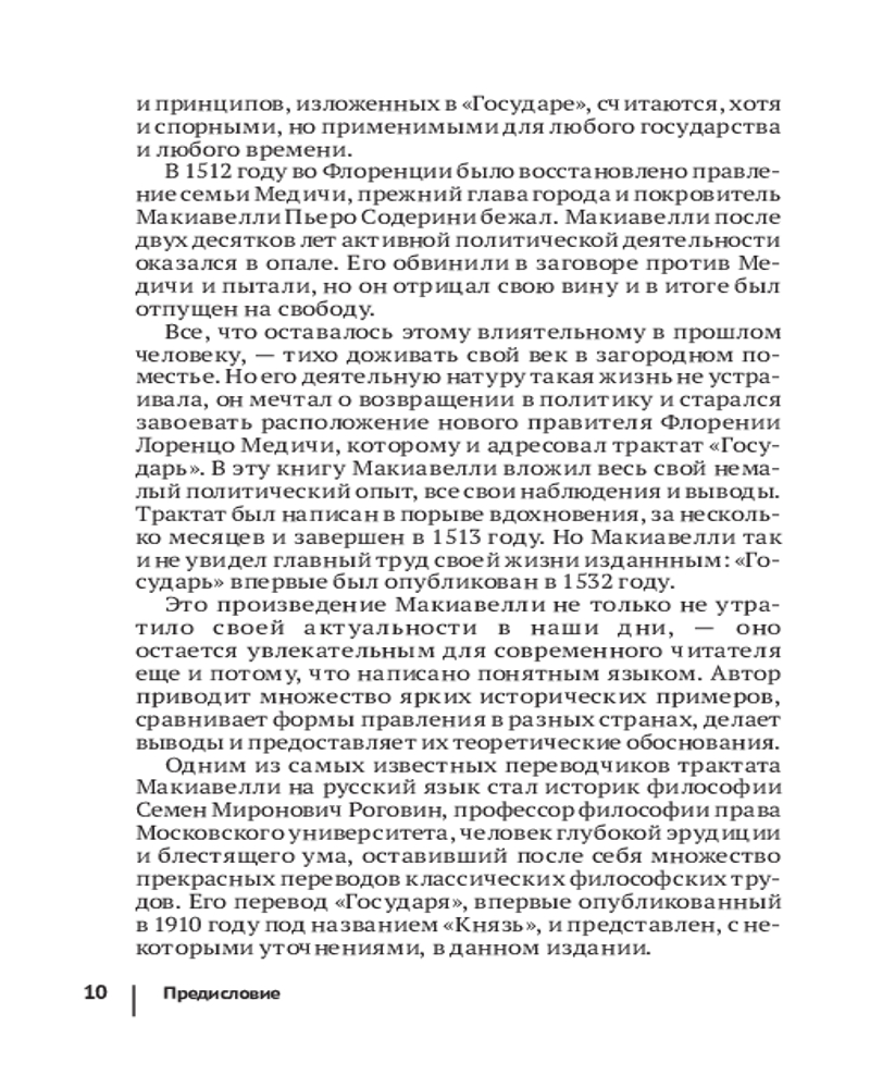 Работа не теряет своей актуальности, начиная с XVI века: здесь можно найти ответы на вопросы о том, каким должен быть правитель, какие методы помогают ему сохранить власть и доброе отношение народа, как грамотно управлять своим государством и выстраивать политические взаимоотношения с другими. Используя исторические примеры, Макиавелли конкретизирует свои тезисы и тем самым дает им право на существование в реальной жизни. Некоторые из этих идей покажутся вам сегодня резкими и провокационными, остальные заиграют по-новому в современной действительности.