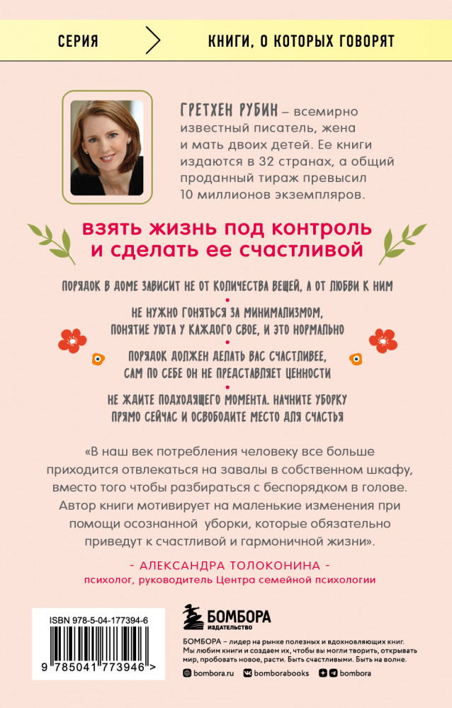 Автор книги мотивирует на маленькие изменения при помощи осознанной уборки, которые обязательно приведут к счастливой и гармоничной жизни». — Александра Толоконина, психолог, руководитель Центра Семейной Психологии |