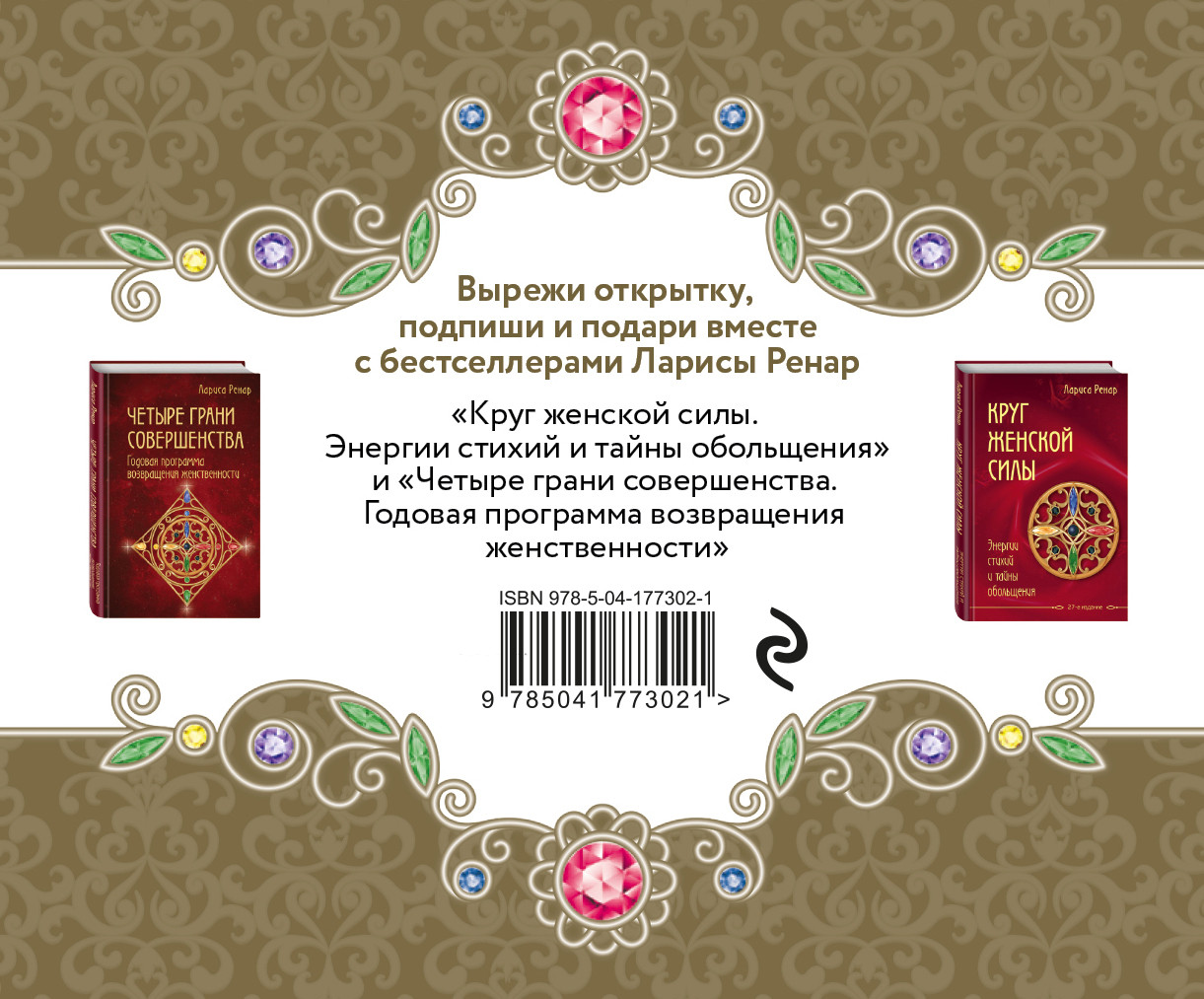 В данный момент этот товар отсутствует в продаже. Возможно, у нас найдется аналогичный или похожий товар здесь. Серия: Лучшее от Ларисы Ренар Подарочный комплект с шикарной бандеролью-открыткой, на которой уже написано душевное пожелание — нужно только ее вырезать и написать, кому она адресована и от кого. В комплект входят бестселлеры Ларисы Ренар «Круг женской силы. Энергии стихий и тайны обольщения» и «Четыре грани совершенства. Годовая программа возвращения женственности».