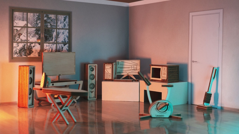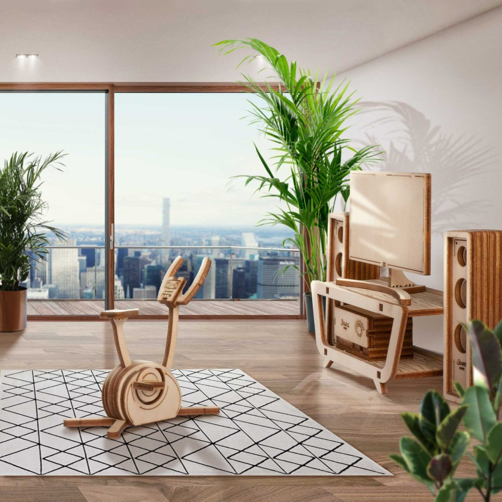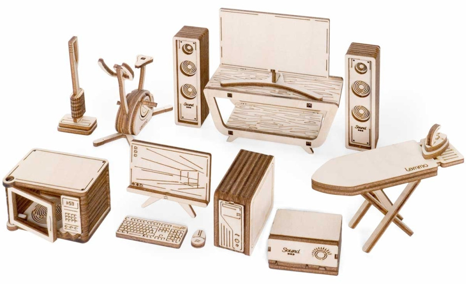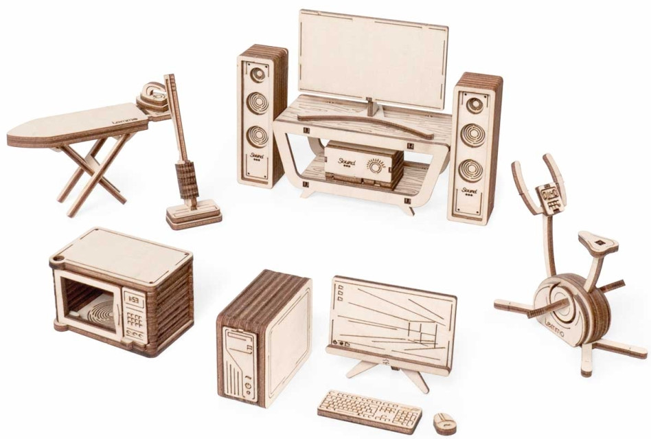 Крутятся педали тренажёра, вращается щётка пылесоса, открывается дверца микроволновки, раскладывается гладильная доска. Наборы подходят для кукольных домов «Венеция» и «Лофт». При желании мебель можно раскрасить акриловыми красками. Так же можно приобрести наборы мебели «Детская» и «Ванная»!