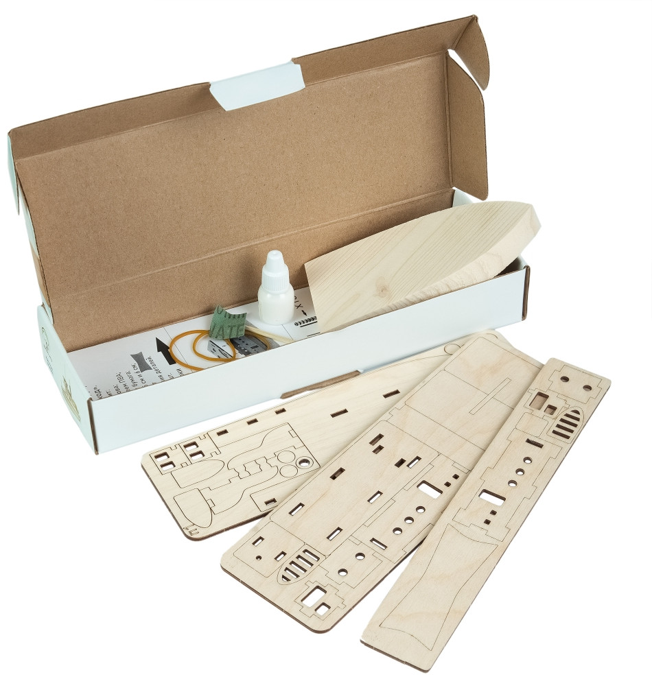 Модель и одновременно игрушка для Вашего ребенка. Набор для начального технического моделирования. Спроектирован таким образом что бы Ваш ребенок освоил начальные технические навыки по сборке простых моделей техники. Включает операции: склеивание деревянных и фанерных деталей, шлифование.