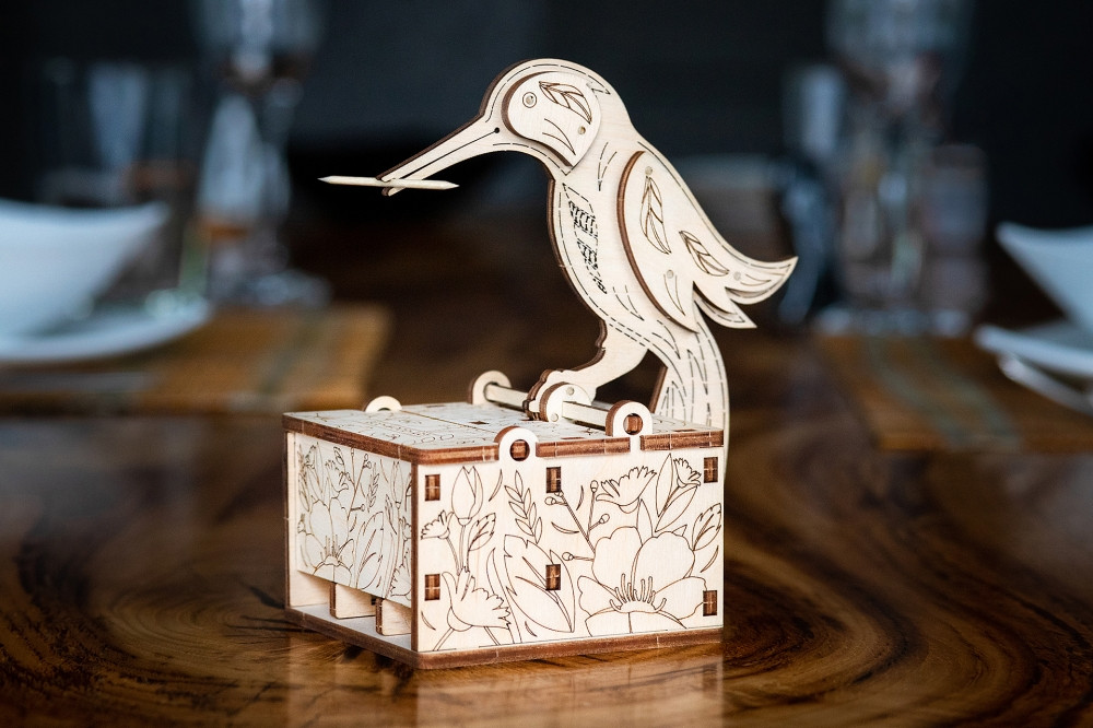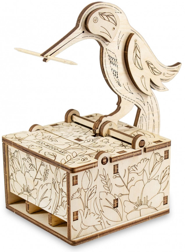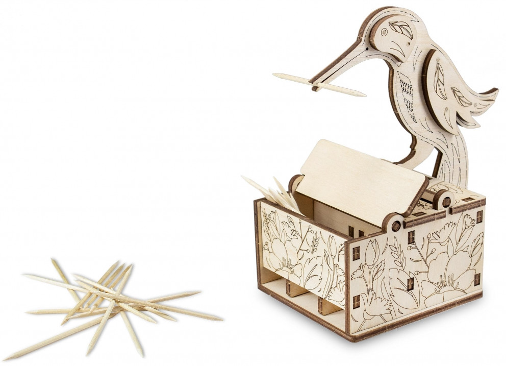 Конструктор интерьерный из дерева «Птичка» от фабрики Eco Wood Art — механическая модель собирается без клея и достаточно просто. Полезный, удобный, стильный и оригинальный гаджет для любой кухни или праздничного стола. Модель может использоваться для дизайна интерьера или эксплуатироваться как обычный диспенсер для зубочисток.