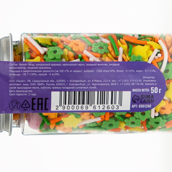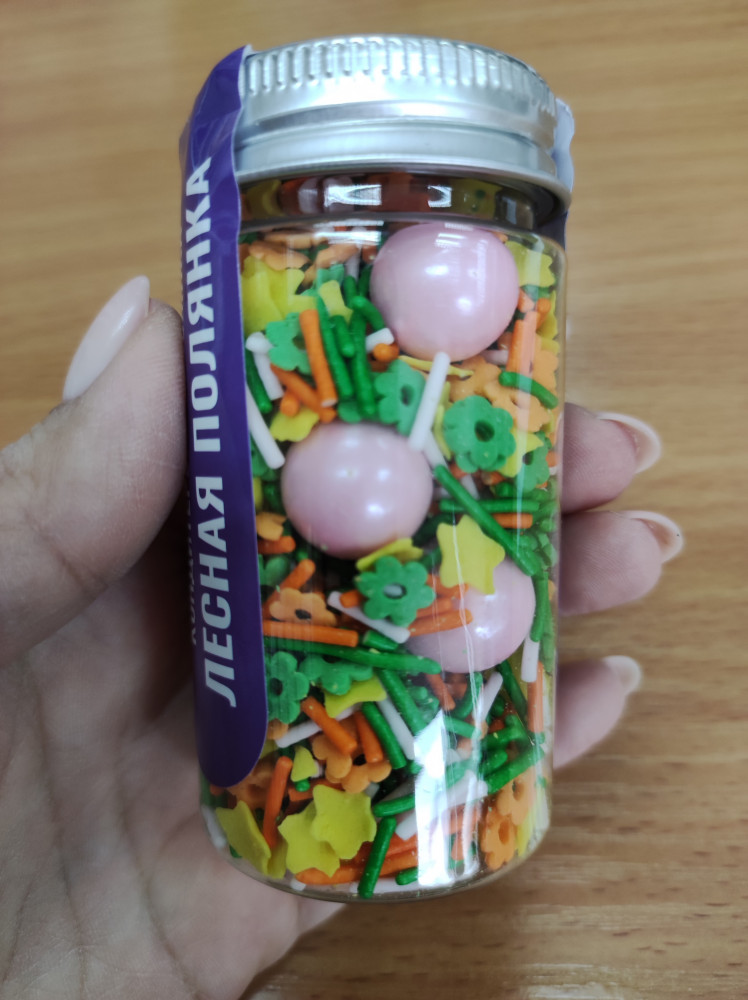Очень яркая посыпка, использовала на 8 марта для украшения торта. По вкусу понравилась, правда большие шарики очень твердые. Упаковано хорошо, сверху наклейка и внутри под крышкой мембрана, которую надо вскрыть.