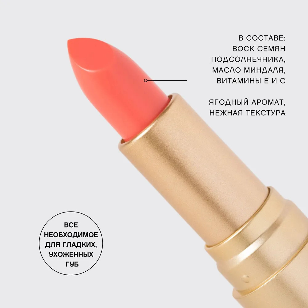 Красивый цвет, нюд. Запах довольно сильный ягодный и сладкий. Похожа на гигиеническую помаду, хорошо смягчает, не скатывается.