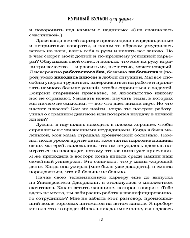Серия: Куриный бульон для души (обложка) История создания книги «Куриный бульон» вдохновляет не меньше, чем маленькие истории, из которых она состоит. Джек Кэнфилд и Марк Хансен, оба популярные мотивационные спикеры, любили свои выступления «приправить» парочкой вдохновляющих историй. После тренингов многие обращались к ним: «А где можно найти ту историю про девочку-скаута? Я бы купил книгу ее сыну», «А та история про парня и щенка — ее можно где-то прочитать?».