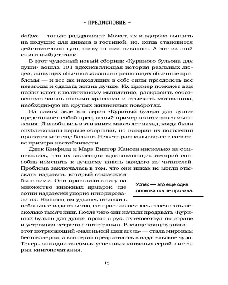 Книгу напечатали, и все, кто давал обещание, купили ее. А дальше... продажи встали. Джек и Марк не хотели сдаваться. У них была цель — продать 1,5 миллиона за 1,5 года. Тогда они придумали «Правило пяти»: ежедневно совершать по пять активных шагов по продвижению и продаже книги. С этого момента Кэнфилд и Хансен каждый день рассылали по 5 экземпляров журналистам, голливудским звездам, делали по 5 звонков руководителям компаний с предложением подарить книги сотрудникам. В итоге через 1,5 года было продано 1,3 миллиона экземпляров. |