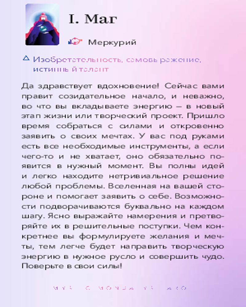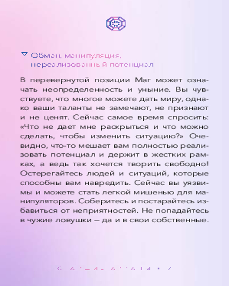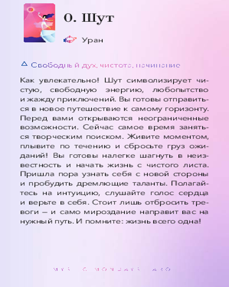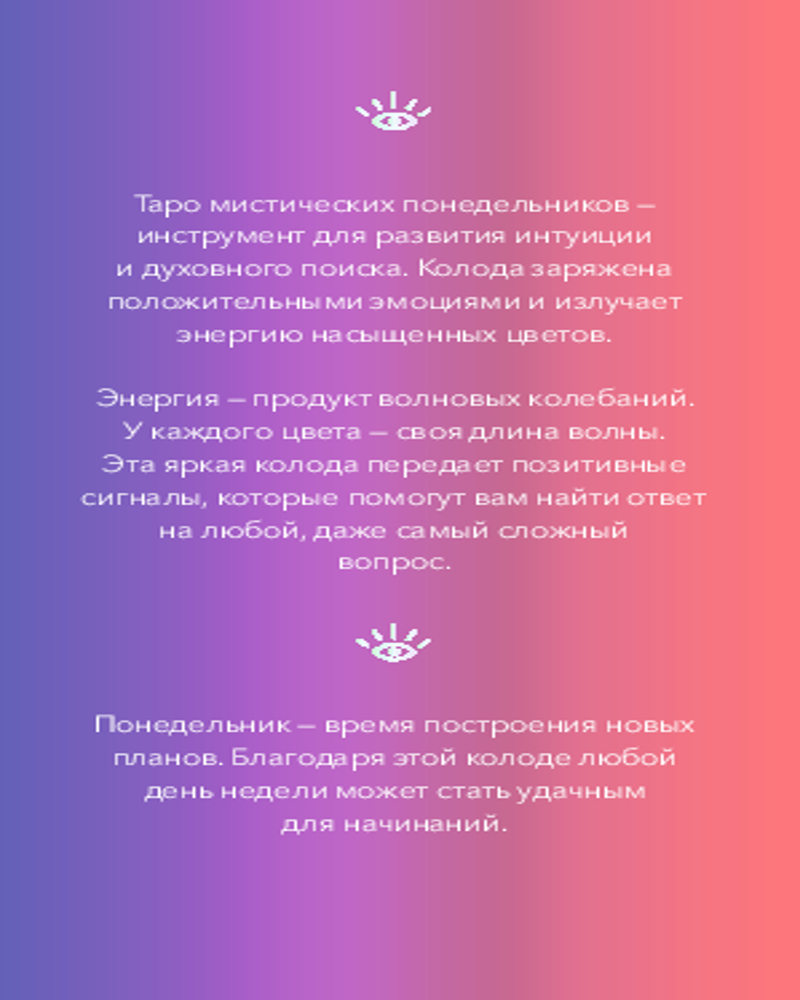 💳 Оплатить за товар можно при получении 🇰🇿 Есть бесплатная доставка по Казахстану от 1 дня 🎁 Копите бонусы с каждой покупки Серия: Таро МИФ Яркая, красиво иллюстрированная колода Таро, одна из самых популярных колод в мире, со дня выхода не покидающая первую страницу рейтинга. |