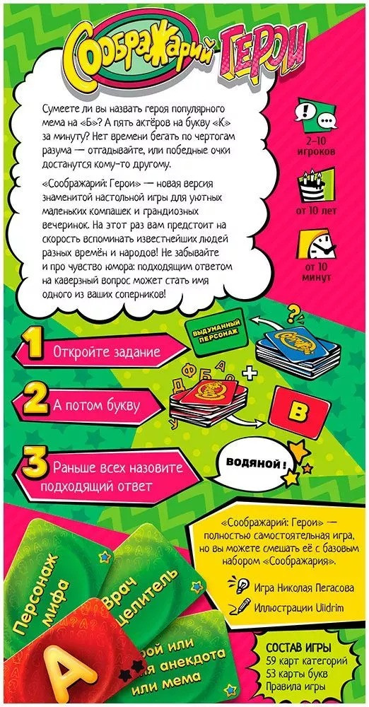 Правила игры: в начале партии перетасуйте колоду «категорий» и колоду «букв» и расположите их на столе таким образом, чтобы всем игрокам было видно. В редких случаях вам может понадобиться таймер на одну минуту. Такой таймер можно найти почти в любом мобильном устройстве. Начинает игру тот игрок, который чаще всех выкладывает фотографии в социальные сети. Он открывает верхнюю карту колоды «категорий» и зачитывает её вслух, после чего переворачивает верхнюю карту колоды «букв». Теперь дело за малым! Игроки стараются как можно быстрее назвать подходящего персонажа. На выложенную букву должно начинаться его имя, фамилия псевдоним или прозвище. Тот, кто первым смог назвать такого персонажа, забирает себе карту категории в качестве победного очка, а карта с буквой уходит в сброс и начинается следующий раунд.