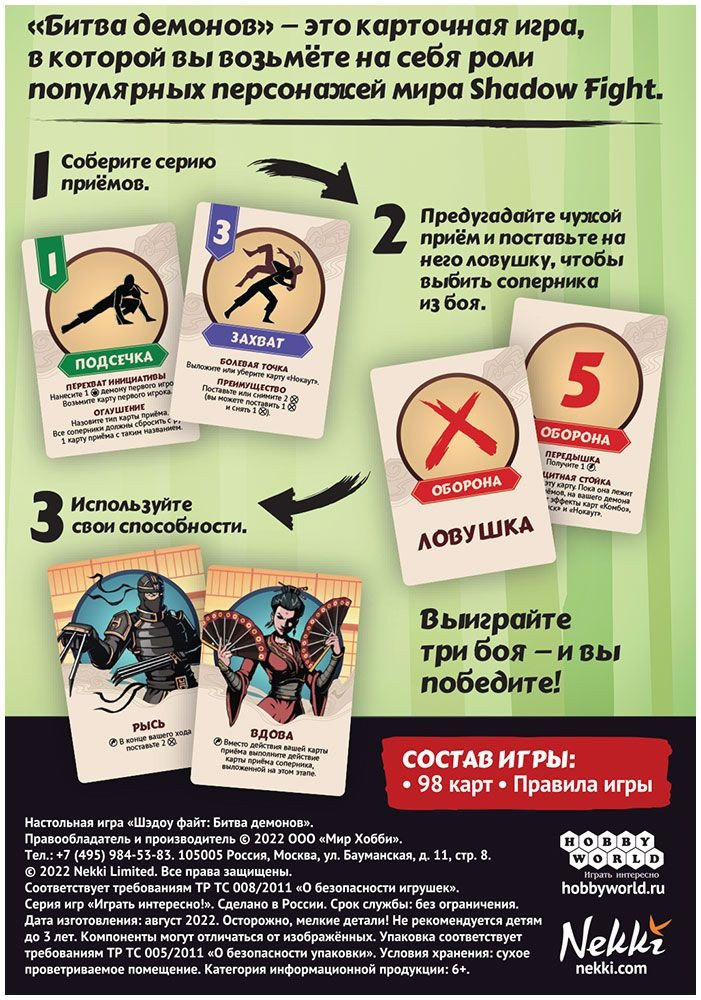 «Битва демонов» — это динамичная карточная настолка, созданная по мотивам популярной мобильной игры Shadow Fight. Взяв на себя роль одного из персонажей (возможно, даже уже знакомого), вам предстоит одолеть всех своих соперников. Для достижения данной цели у вас есть целый арсенал приёмов, различные комбо, ловушки и уникальная способность собственного демона. Одержите ряд побед, чтобы стать полноправным наследником грозного Титана.