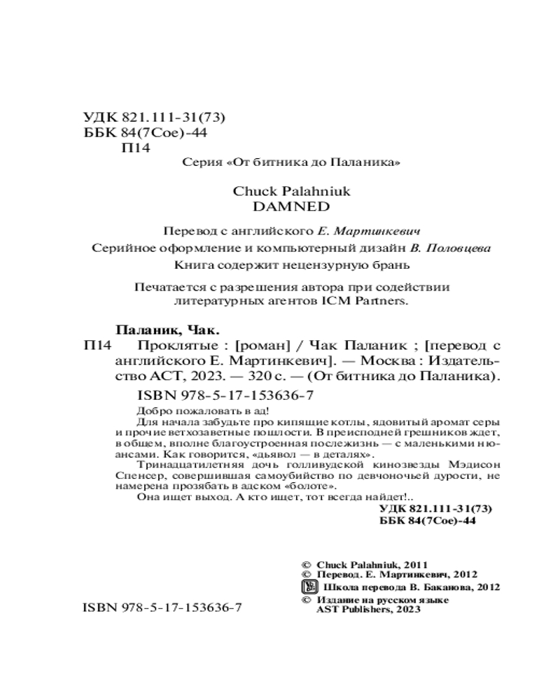 ПроклятыеВ данный момент этот товар отсутствует в продаже. Возможно, у нас найдется аналогичный или похожий товар здесь. Серия: От битника до Паланика (м) Чак Паланик. «Сумасшедший гений» не «поколения Икс», но — поколения следующего. Автор, чьи романы «Удушье», «Колыбельная», «Уцелевший» и «Невидимки» снискали славу культовой классики современной альтернативной прозы. Автор, который действительно «взорвал мир» своим легендарным «Бойцовским клубом». |