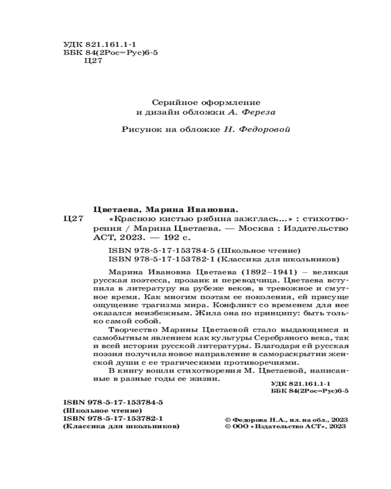 💳 Оплатить за товар можно при получении 🇰🇿 Есть бесплатная доставка по Казахстану от 1 дня 🎁 Копите бонусы с каждой покупки Серия: Школьное чтение Марина Ивановна Цветаева (1892-1941) — великая русская поэтесса, прозаик и переводчица. Цветаева вступила в литературу на рубеже веков, в тревожное и смутное время. Как многим поэтам ее поколения, ей присуще ощущение трагизма мира. Конфликт со временем для нее оказался неизбежным. Жила она по принципу: быть только самой собой. |