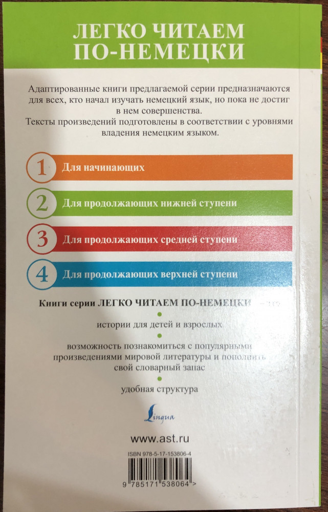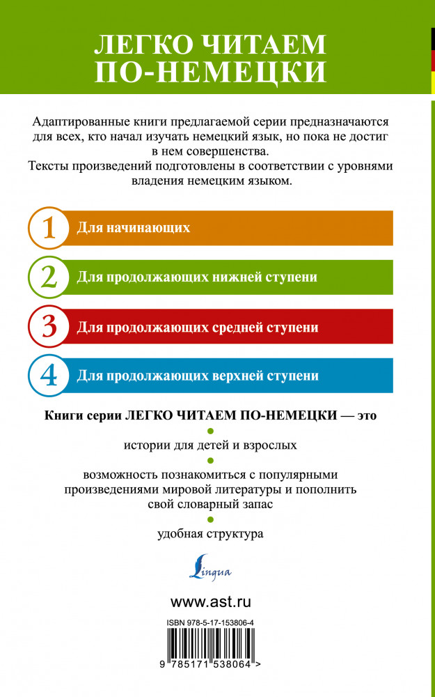 Тексты рассказов адаптированы для уровней A2-B1 (для продолжающих изучать немецкий язык нижней ступени) и снабжены комментариями. В конце книги — словарь используемой лексики, облегчающий чтение. |