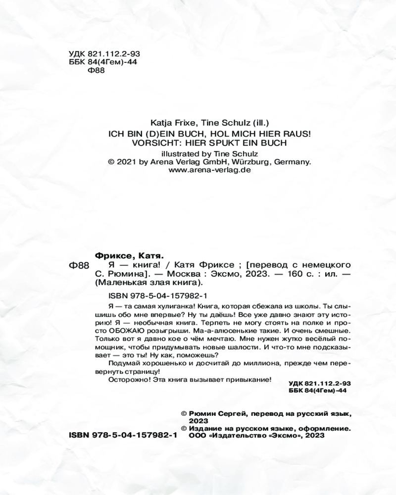 яркие иллюстрации для малышей В данный момент этот товар отсутствует в продаже. Возможно, у нас найдется аналогичный или похожий товар здесь. Серия: Детск. Маленькая злая книга Эта книга такая хулиганка! Не веришь? Скорее открой её и убедись в этом сам! Книга обожает загадки, шутки и забавные истории. И прямо сейчас ей очень-очень нужна твоя помощь, чтобы раскрыть малю-ю-юсенький секрет. Говорят, в школе, где живёт книга, завёлся дух! Он то играет на пианино, то устраивает погром в классе... Нужно срочно его поймать! Ну как, поможешь?