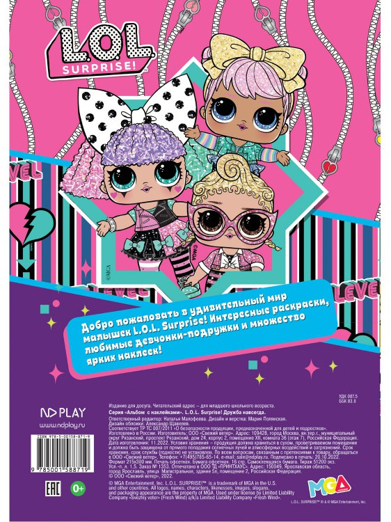 💳 Оплатить за товар можно при получении 🇰🇿 Есть бесплатная доставка по Казахстану от 1 дня 🎁 Копите бонусы с каждой покупки Серия: L.O.L. Surprise! Серия книг «Альбом с наклейками» − это большие альбомы с популярными детскими брендами, раскраски и развивающие задания. В альбоме «L.O.L. Surprise!» детей ждут модные куколки-подружки, которые приготовили много сюрпризов. Ребенок будет раскрашивать кукол L.O.L. Surprise!, приклеивать недостающие части нарядов и дополнять картинки по смыслу с помощью наклеек. |
