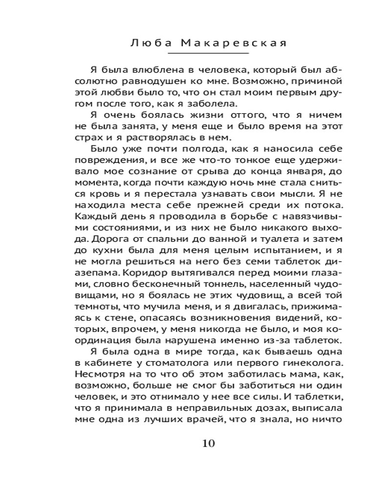 «Открывающая книгу цитата из Сабины Шпильрейн здесь, конечно, не случайна. Существует особенная линия женского письма: Вирджиния Вульф, Сильвия Плат, Энн Секстон, Элизабет Вурцель. Люба Макаревская сознательно идет по их следам. Это, в первую очередь, книга о саморазрушении и стремлении к Танатосу». — Ольга Брейнингер, писатель. |
