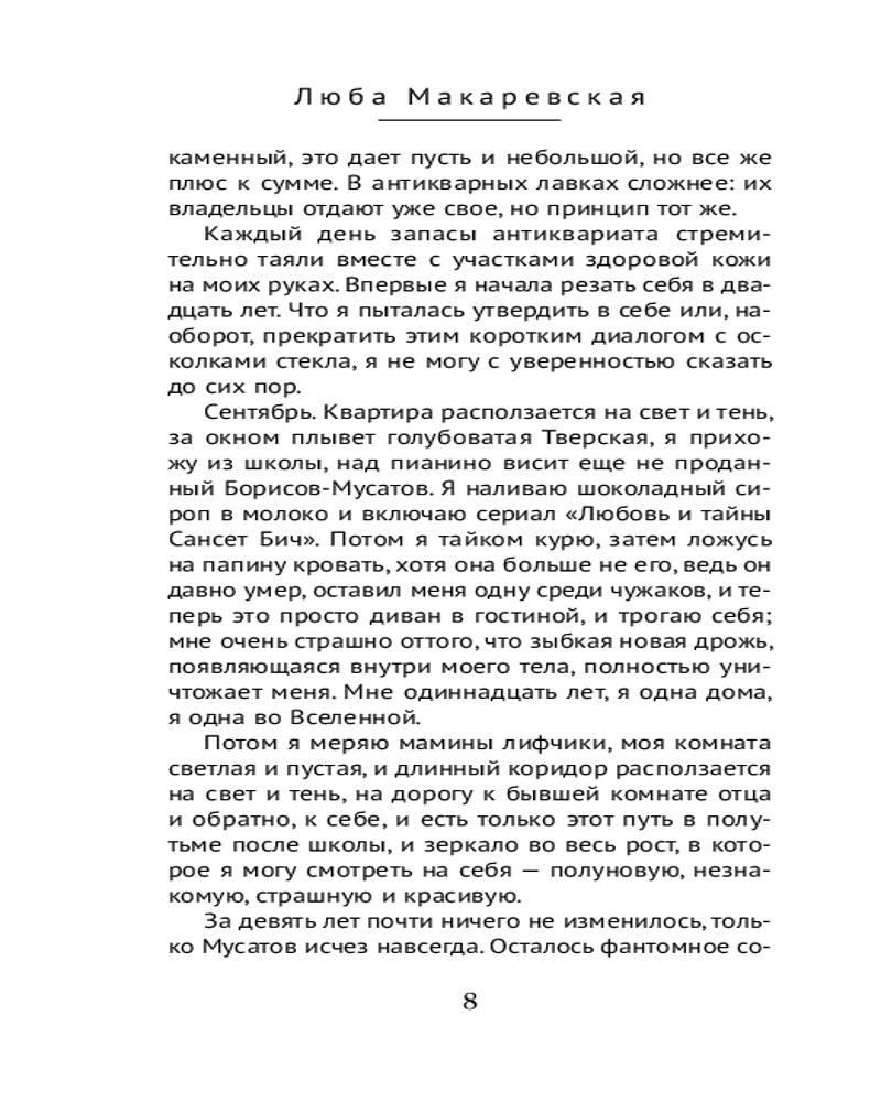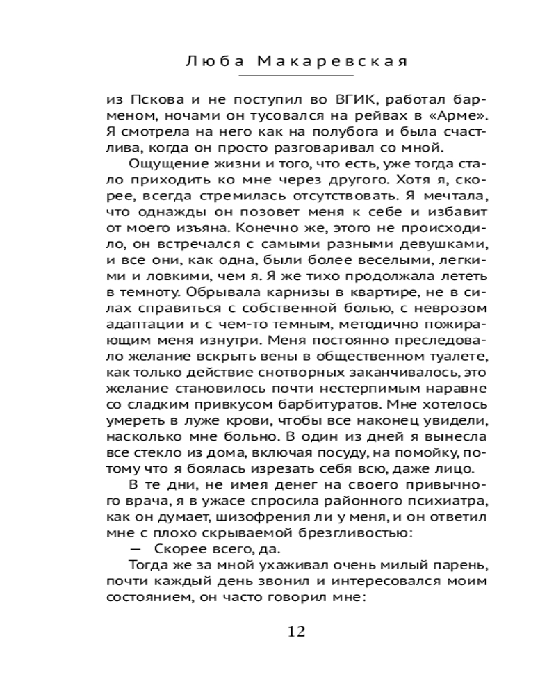 Серия: Loft. Современный роман. В моменте Рассказы Любы Макаревской можно квалифицировать как прозу поэта — автор действительно поэт и управляется с русским языком, как опытный дрессировщик с тигром. А можно — по степени искренности, откровенности и стремлению ясно видеть вещи, на которые прямо смотреть практически невозможно, больно, стыдно, страшно, то есть воспринимать их как предельно серьезный разговор о самом важном.