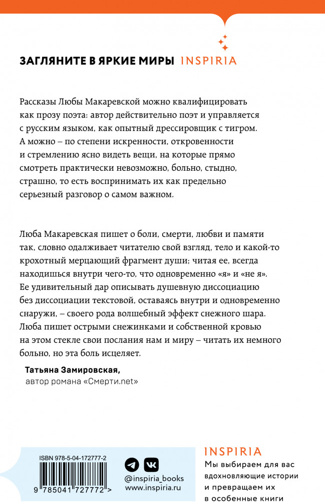 «Люба Макаревская пишет о боли, смерти, любви и памяти так, словно одалживает читателю свой взгляд, тело и какой-то крохотный мерцающий фрагмент души; читая ее, всегда находишься внутри чего-то, что одновременно «я» и «не я». Ее удивительный дар описывать душевную диссоциацию без диссоциации текстовой, оставаясь внутри и одновременно снаружи — своего рода волшебный эффект снежного шара. Люба пишет острыми снежинками и собственной кровью на этом стекле свои послания нам и миру — читать их немного больно, но эта боль исцеляет». — Татьяна Замировская, автор романа «Смерти. net».