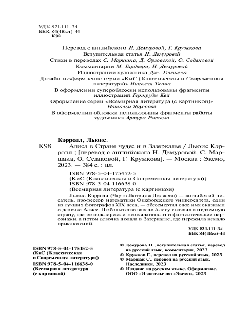 Серия: КиС (Классическая и Современная литература) Льюис Кэрролл (Чарлз Лютвидж Доджсон) — английский писатель, профессор математики Оксфордского университета, один из лучших фотографов ХIХ века, — обессмертил свое имя сказками о девочке Алисе. Любопытство завело Алису сначала в подземную страну, где ее подстерегали неожиданности и фантастические персонажи, а потом девочка попала в Зазеркалье, где пережила немало приключений. |