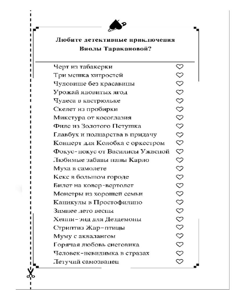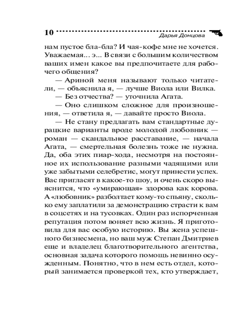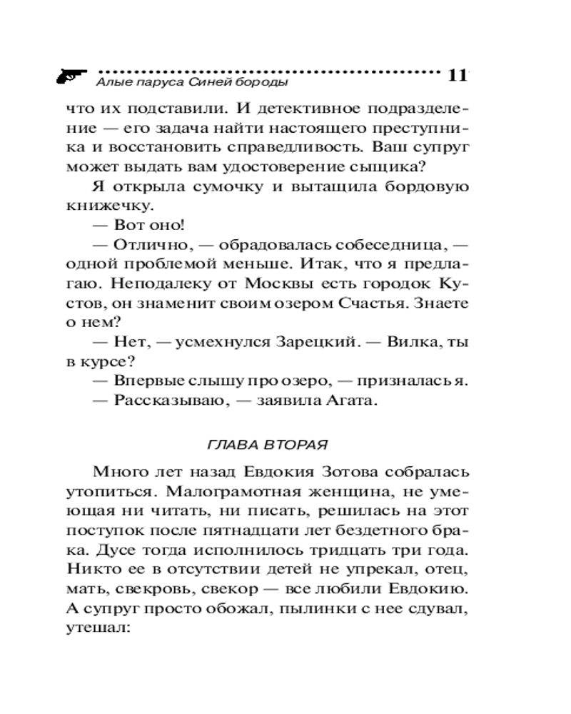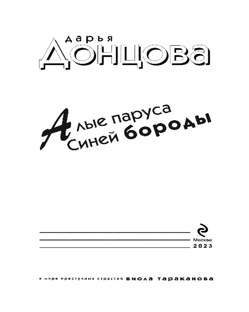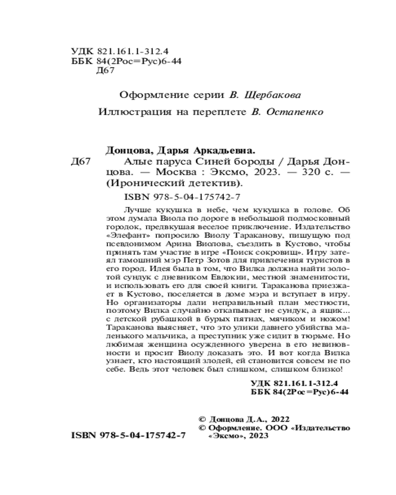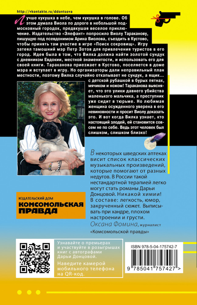 Алые паруса Синей бородыВ данный момент этот товар отсутствует в продаже. Возможно, у нас найдется аналогичный или похожий товар здесь. Серия: Иронический детектив (обложка) Лучше кукушка в небе, чем кукушка в голове. Об этом думала Виола по дороге в небольшой подмосковный городок, предвкушая веселое приключение. Издательство «Элефант» попросило Виолу Тараканову, пишущую под псевдонимом Арина Виолова, съездить в Кустово, чтобы принять там участие в игре «Поиск сокровищ». Игру затеял тамошний мэр Петр Зотов для привлечения туристов в его город. Идея была в том, что Вилка должна найти золотой сундук с дневником Евдокии, местной знаменитости, и использовать его для своей книги. Тараканова приезжает в Кустово, поселяется в доме мэра и вступает в игру. Но организаторы дали неправильный план местности, поэтому Вилка случайно откапывает не сундук, а ящик... с детской рубашкой в бурых пятнах, мячиком и ножом! Тараканова выясняет, что это — улики давнего убийства маленького мальчика, а преступник уже сидит в тюрьме. Но любимая женщина осужденного уверена в его невиновности и просит Виолу доказать это. И вот когда Вилка узнает, кто настоящий злодей, ей становится совсем не по себе. Ведь этот человек был слишком, слишком близко! |