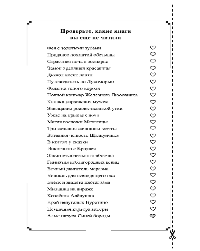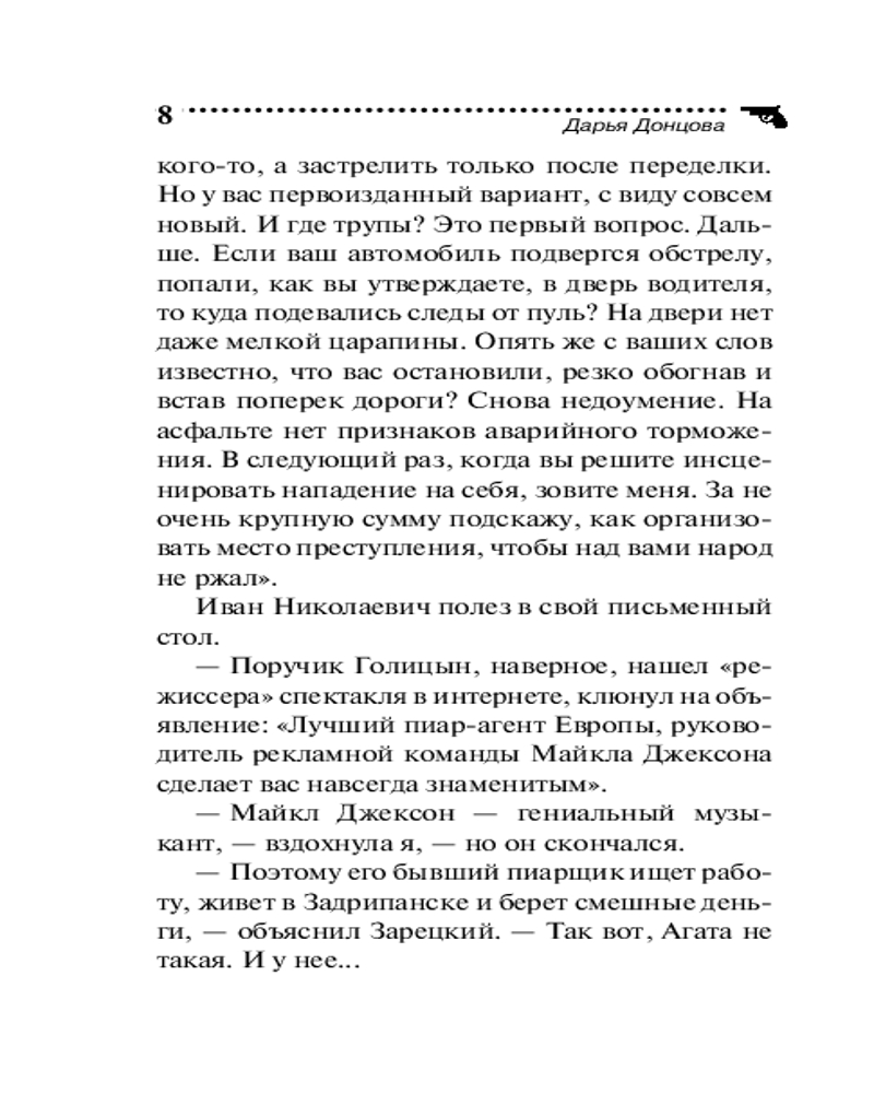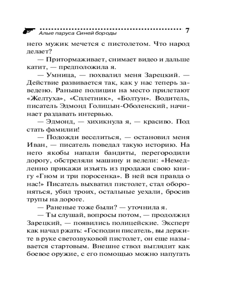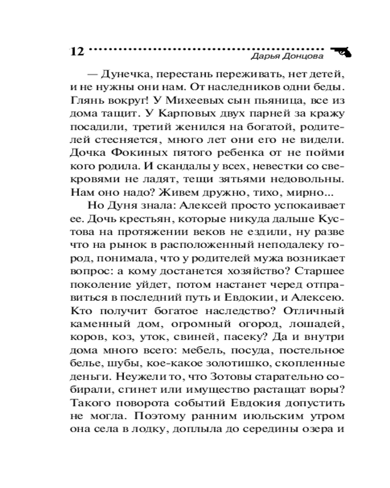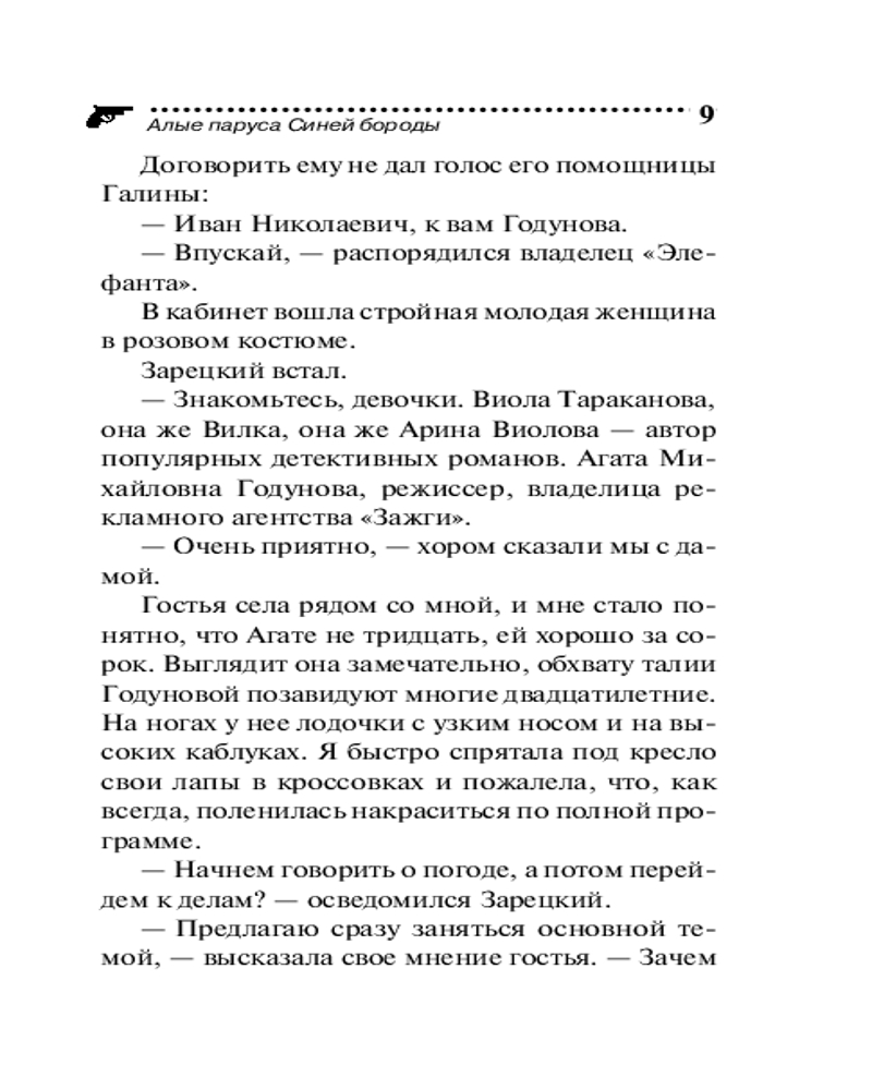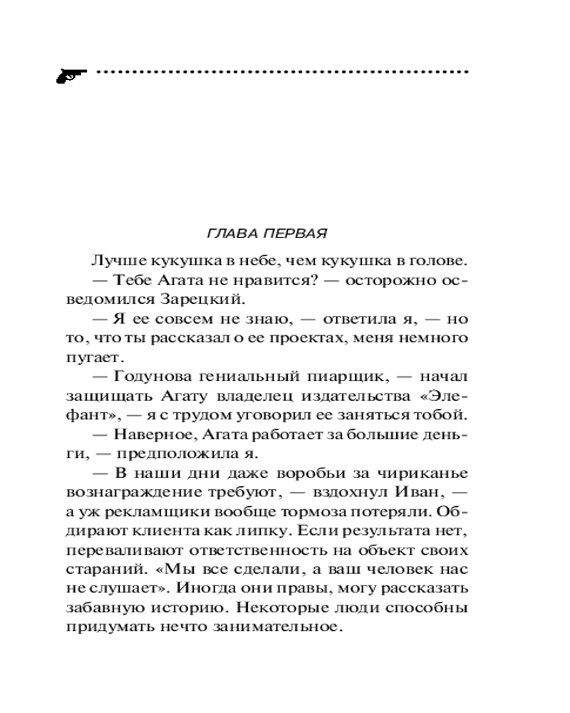 Алые паруса Синей бородыВ данный момент этот товар отсутствует в продаже. Возможно, у нас найдется аналогичный или похожий товар здесь. Серия: Иронический детектив (обложка) Лучше кукушка в небе, чем кукушка в голове. Об этом думала Виола по дороге в небольшой подмосковный городок, предвкушая веселое приключение. Издательство «Элефант» попросило Виолу Тараканову, пишущую под псевдонимом Арина Виолова, съездить в Кустово, чтобы принять там участие в игре «Поиск сокровищ». Игру затеял тамошний мэр Петр Зотов для привлечения туристов в его город. Идея была в том, что Вилка должна найти золотой сундук с дневником Евдокии, местной знаменитости, и использовать его для своей книги. Тараканова приезжает в Кустово, поселяется в доме мэра и вступает в игру. Но организаторы дали неправильный план местности, поэтому Вилка случайно откапывает не сундук, а ящик... с детской рубашкой в бурых пятнах, мячиком и ножом! Тараканова выясняет, что это — улики давнего убийства маленького мальчика, а преступник уже сидит в тюрьме. Но любимая женщина осужденного уверена в его невиновности и просит Виолу доказать это. И вот когда Вилка узнает, кто настоящий злодей, ей становится совсем не по себе. Ведь этот человек был слишком, слишком близко! |