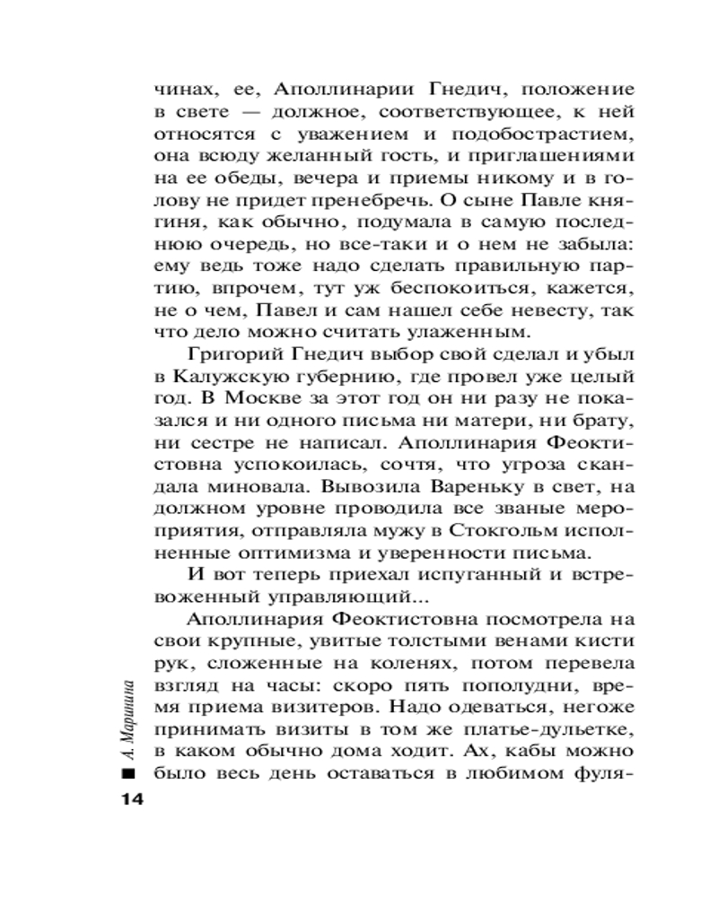 «Маринина не только пишет детективные романы, но и отвечает на вечные вопросы. Автор относится к своим читателям как добрый и опытный учитель к ученикам, которые нуждаются в поддержке, подсказке и направлении на верный путь. Оптимистичная и практичная в своей дидактике, Маринина ставит перед собой вопрос «как жить» и старается помочь читателю найти свой путь к лучшей жизни в сегодняшнем мире. Своими детективами Маринина пишет современный роман «воспитания чувств»: основная цель автора — воспитание посредством развлечения». — Анатолий Вишевский, Гринелльский колледж, США.