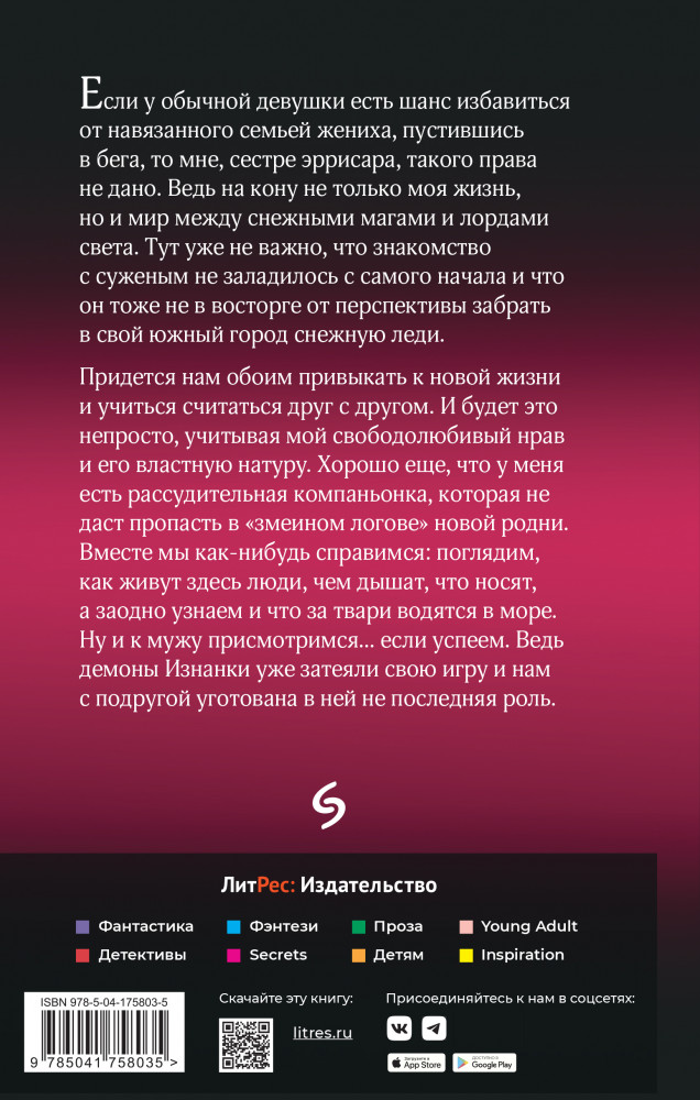 💳 Оплатить за товар можно при получении 🇰🇿 Есть бесплатная доставка по Казахстану от 1 дня 🎁 Копите бонусы с каждой покупки Серия: Звезды Литреса Если у обычной девушки есть шанс избавиться от навязанного семьей жениха, пустившись в бега, то мне, сестре эррисара, такого права не дано. Ведь на кону не только моя жизнь, но и мир между снежными магами и лордами света. Тут уже не важно, что знакомство с суженым не заладилось с самого начала и что он тоже не в восторге от перспективы забрать в свой южный город снежную леди. |