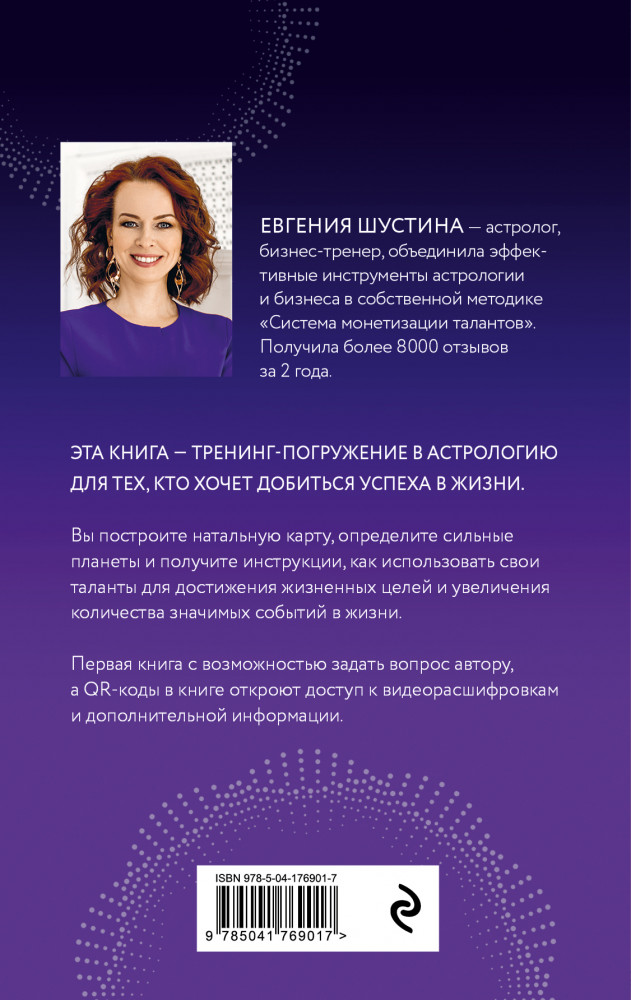 В данный момент этот товар отсутствует в продаже. Возможно, у нас найдется аналогичный или похожий товар здесь. Серия: Школа практической астрологии Евгении Шустиной Евгения Шустина — астролог, бизнес-тренер, объединила эффективные инструменты астрологии и бизнеса в собственной методике «Система монетизации талантов». Получила более 8000 отзывов за 2 года.