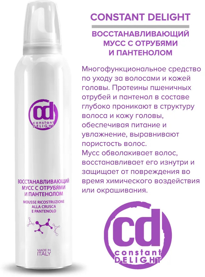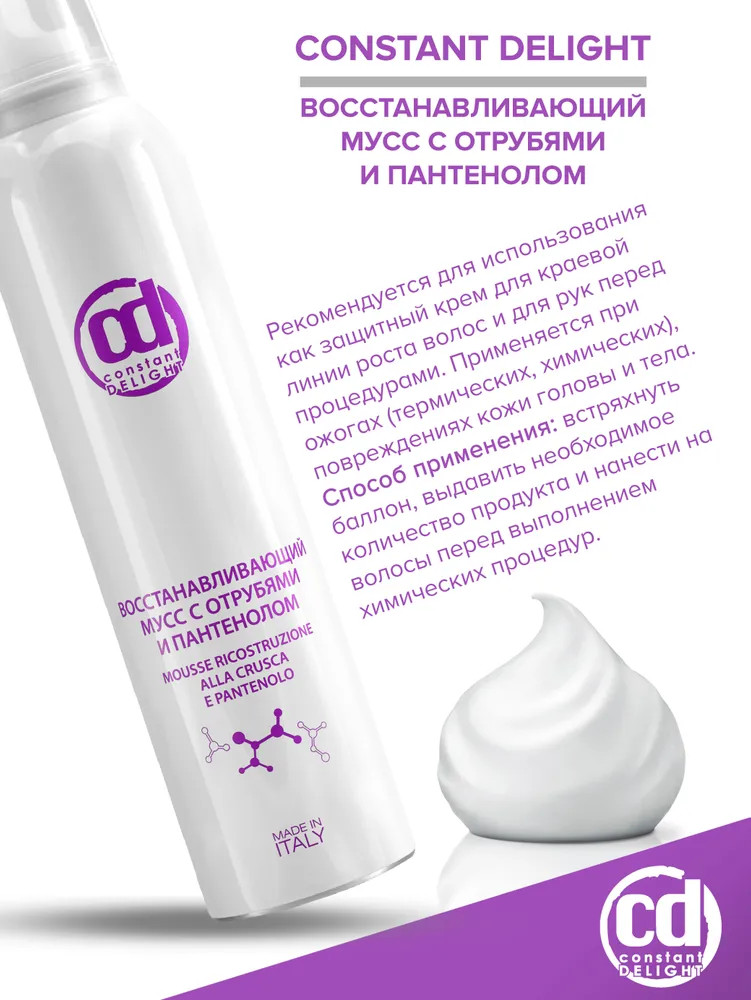 Constant Delight Мусс для волос восстановливающий с отрубями и пантеноломВ данный момент этот товар отсутствует в продаже. Возможно, у нас найдется аналогичный или похожий товар здесь. Серия: Эксперт-уход Многофункциональное средство по уходу за волосами и кожей головы. Протеины пшеничных отрубей и пантенол, входящие в состав, глубоко проникают в структуру волоса и кожу головы, обеспечивая дополнительное питание и увлажнение, выравнивают пористость волос. Мусс обволакивает волос, восстанавливает его изнутри и защищает от повреждения во время химического воздействия или окрашивания. Рекомендуется для использования как защитный крем для краевой линии роста волос и для рук перед процедурами. Применяется при любых ожогах (термических, химических), а также при повреждениях кожи головы и тела. |
