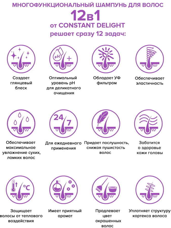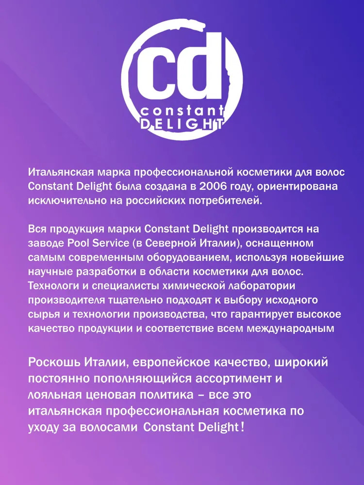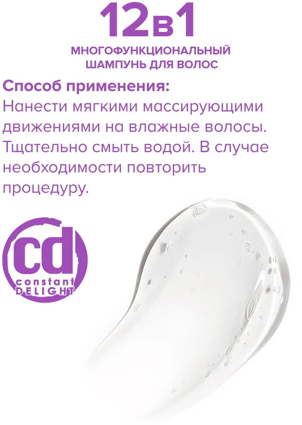 Constant Delight Шампунь для волос многофункциональный «12 в 1»В данный момент этот товар отсутствует в продаже. Возможно, у нас найдется аналогичный или похожий товар здесь. Серия: Эксперт-уход Оптимальный уровень РН для деликатного очищения волос и кожи головы. Деликатно очищает кожу головы и волосы, уплотняет структуру кортекса, обеспечивает эластичность. Способствует сохранению цвета окрашенных волос. Придает блеск. Дисциплинирует непослушные волосы. Защищает волосы от воздействия УФ-лучей. Содержит базовую термозащиту волос. Подходит для ежедневного применения. |
