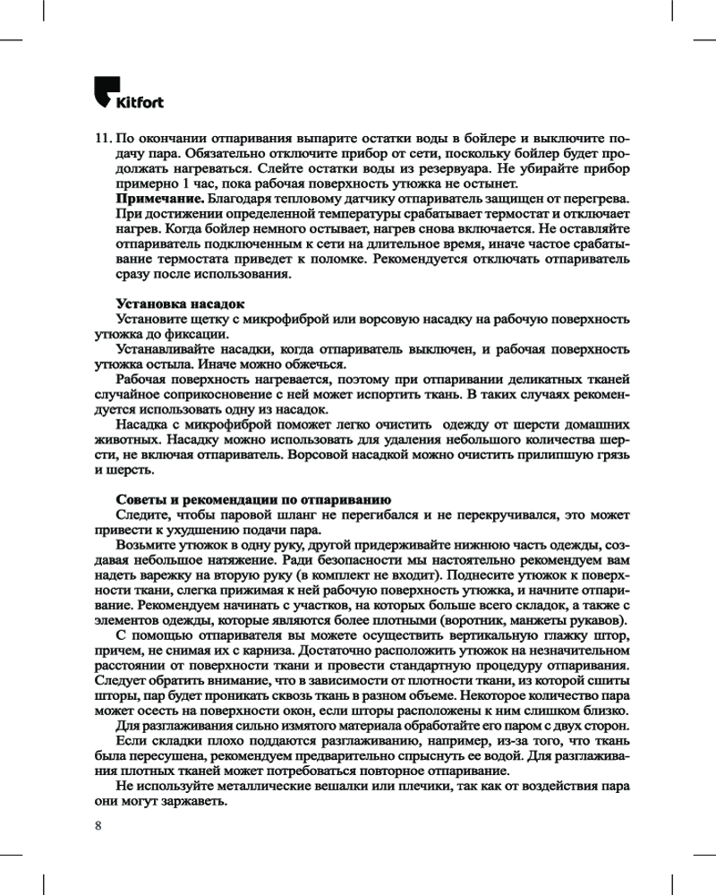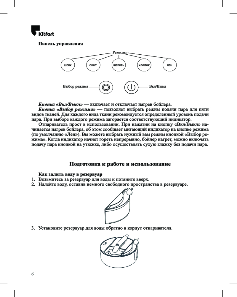 Предусмотрено 5 режимов подачи пара для различных типов тканей: шёлк, синтетика, шерсть, хлопок, лён. На паровом утюжке располагается кнопка подачи пара. В случае неиспользования прибора в течение 8 мин, сработает автоотключение.