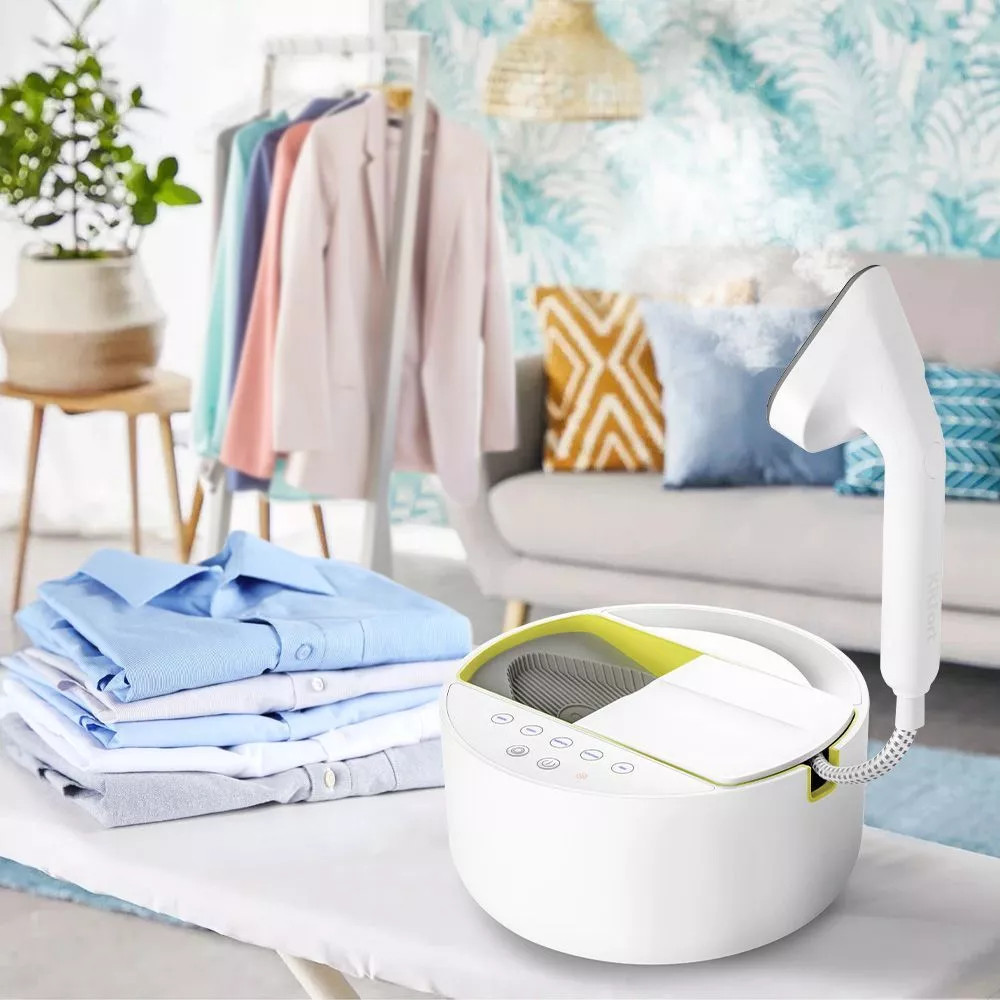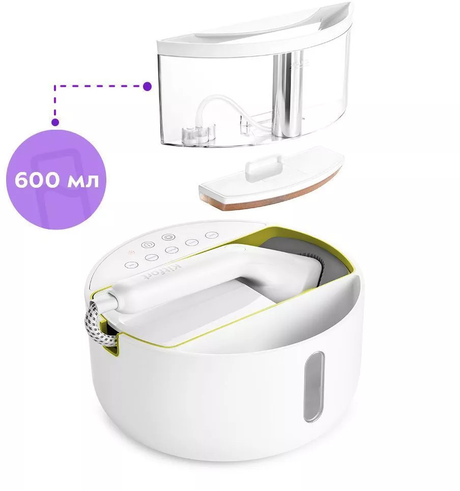 Ёмкость съёмного резервуара составляет 600 мл. Такого объёма хватит примерно на полчаса беспрерывного отпаривания (на 2ом уровне подачи пара). Время нагрева составит 80 сек. Под бачком есть деминерализационный фильтр.