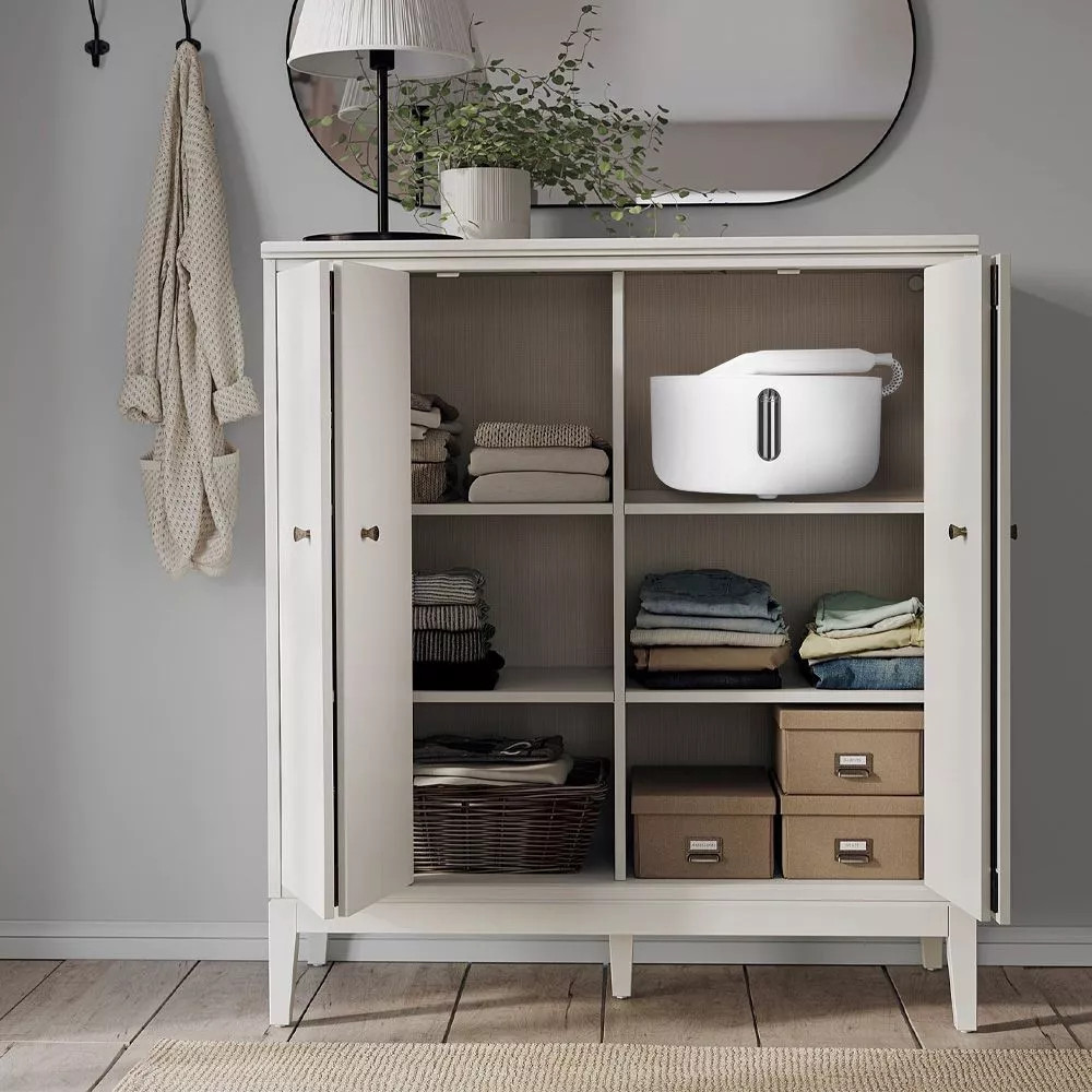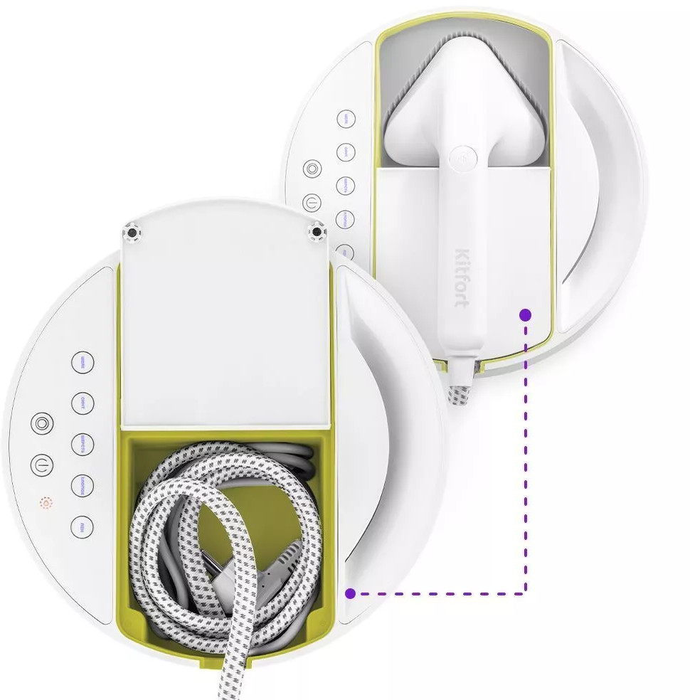 На корпусе отпаривателя есть отсек для хранения парового шланга и шнура, закрываемый крышкой. Сам утюжок надёжно фиксируется в отверстии со специальной силиконовой подложкой, поэтому нагретый утюжок можно устанавливать туда прямо во время работы.